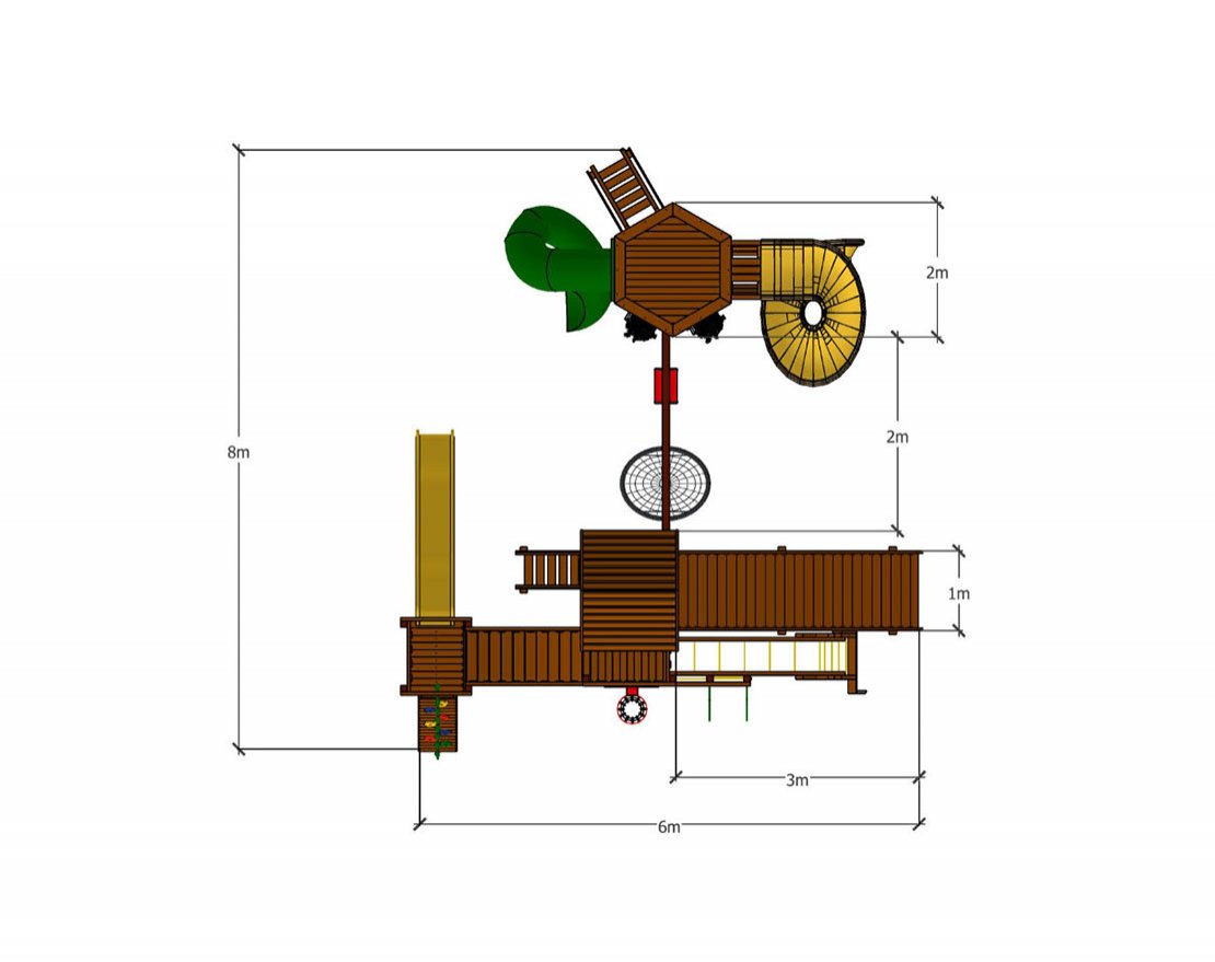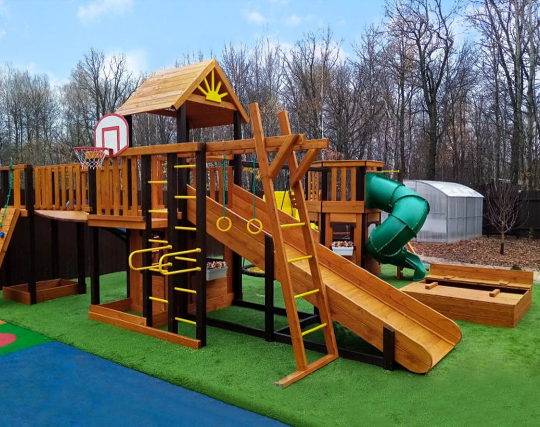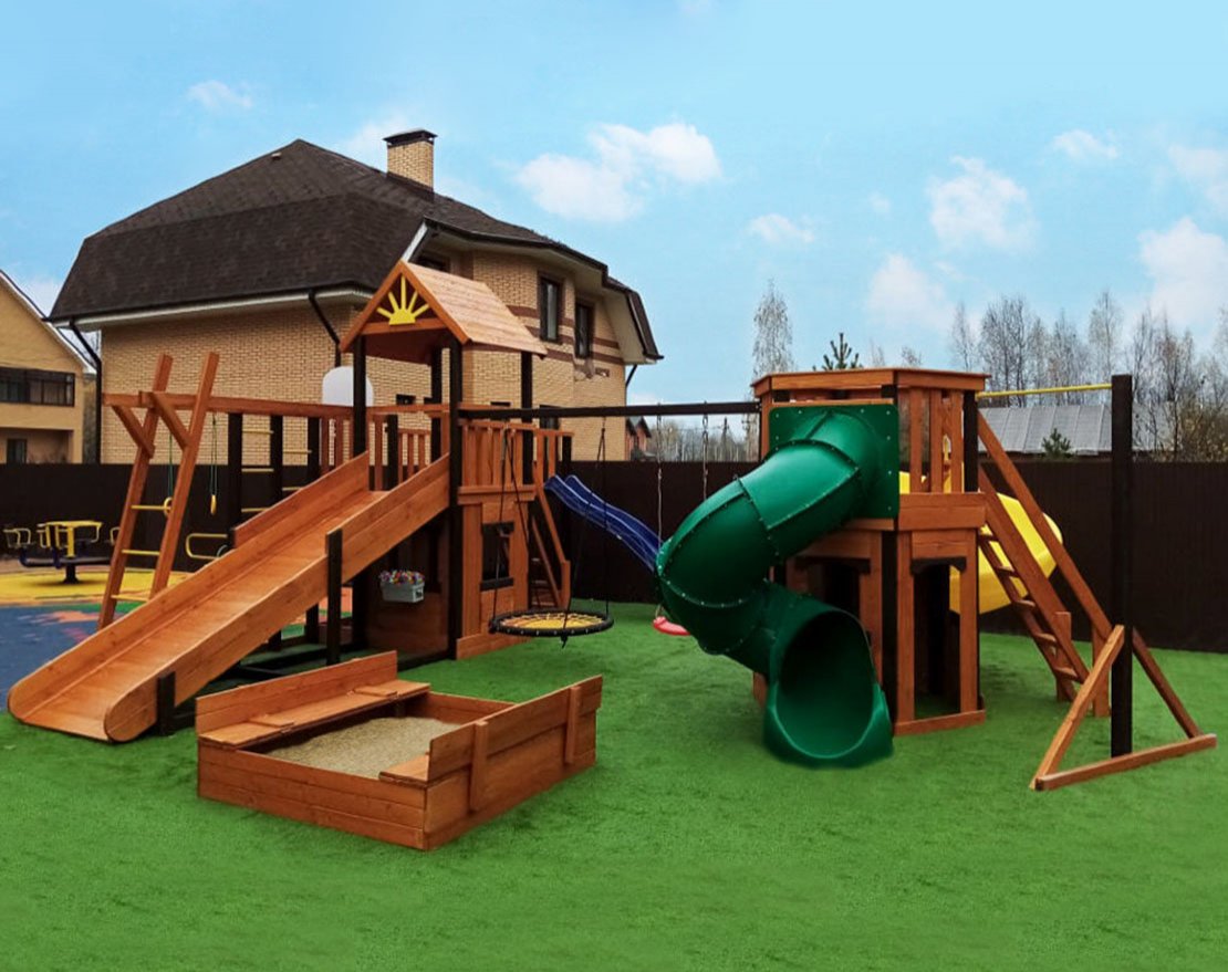Комплекс гармонично сочетает развлекательные и спортивные модули. Занятия на шведской стенке, турнике, брусьях, кольцах, сетке для лазания научат ребенка слушать свое тело, оценивать его возможности. Они укрепят его мышцы, сделают более ловким и выносливым, сформируют базовые спортивные навыки, а это так важно сегодня, когда все больше детей из-за гиподинамии страдают от проблем со спиной, лишнего веса и др.