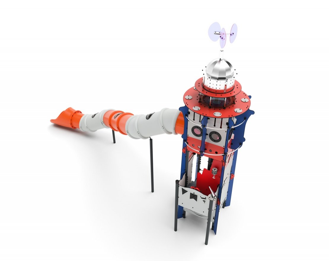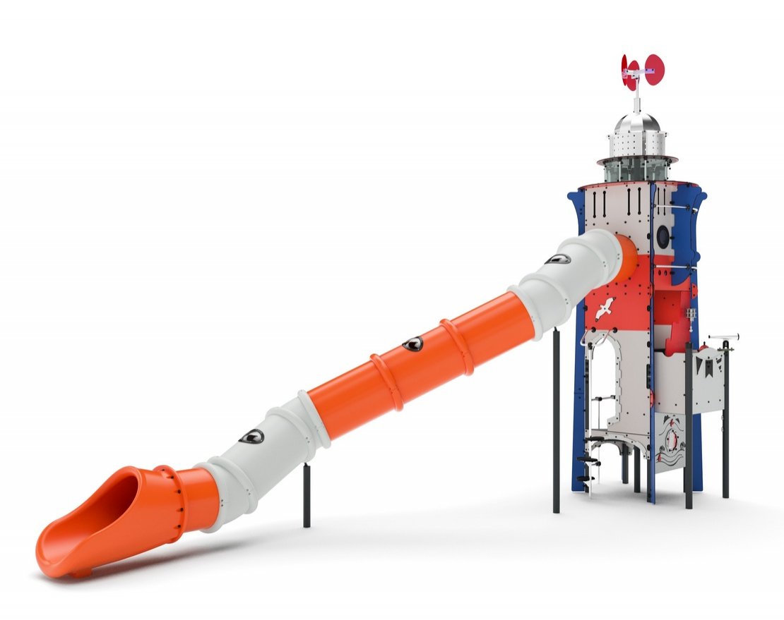 Комплекс выполнен в виде маяка. Состоит из металлического каркаса, пластиковых панелей, окон из поликарбонатного стекла и большой тоннельной пластиковой горки с иллюминаторами.