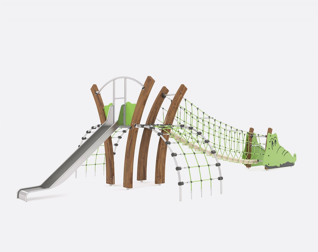 Состоит из опорных стоек, канатных сеток, пластиковых панелей и металлической горки с защитными бортиками.