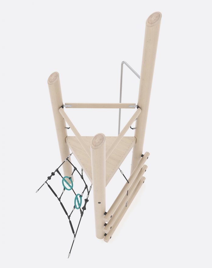 Состоит из опорных стоек, перекладин, металлической трубы-лазалки и канатной сетки. Для большего комфорта, конструкция оснащена пластиковыми уступами и ручками-стропами.