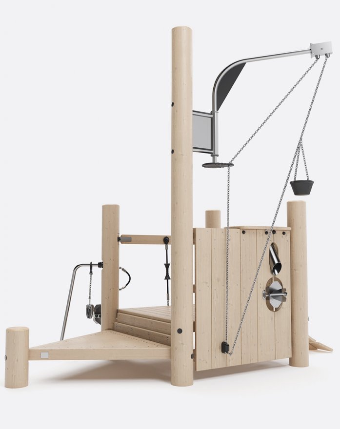Состоит из опорных стоек, платформы и панели, предназначенной для игр с водой и песком. Панель оснащена металлическими ковшами, чашами, резиновыми ведрами и мельницами. Для большего комфорта, в конструкции установлены ручки-стропы и уступы.
