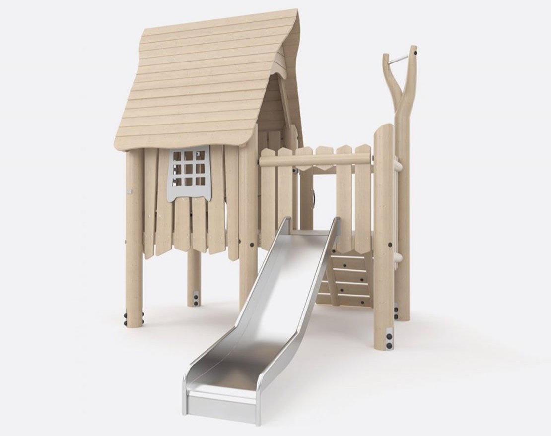 Представляет собой закрытый домик с крышей, стенами, окнами, небольшой металлической горкой с защитными бортиками и пандусом со скалодромными зацепами. Внутри домика установлена небольшая скамейка и подоконник. Для большего комфорта, конструкция оснащена ручками-стропами.