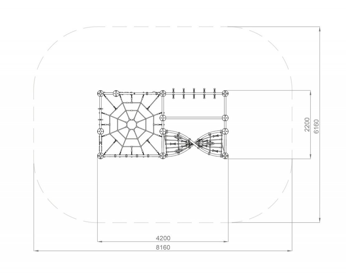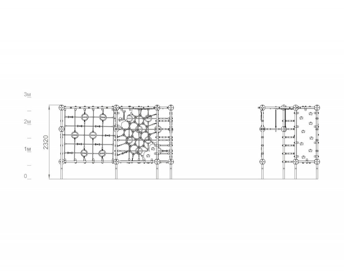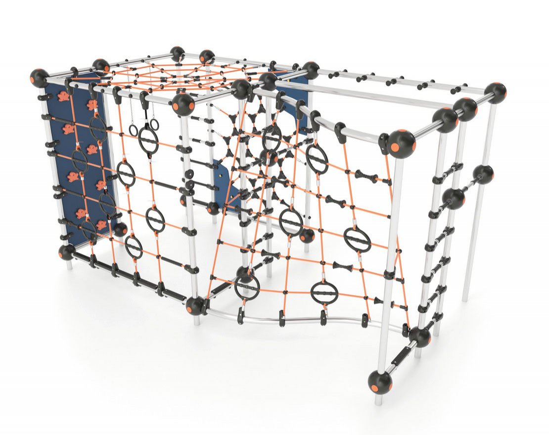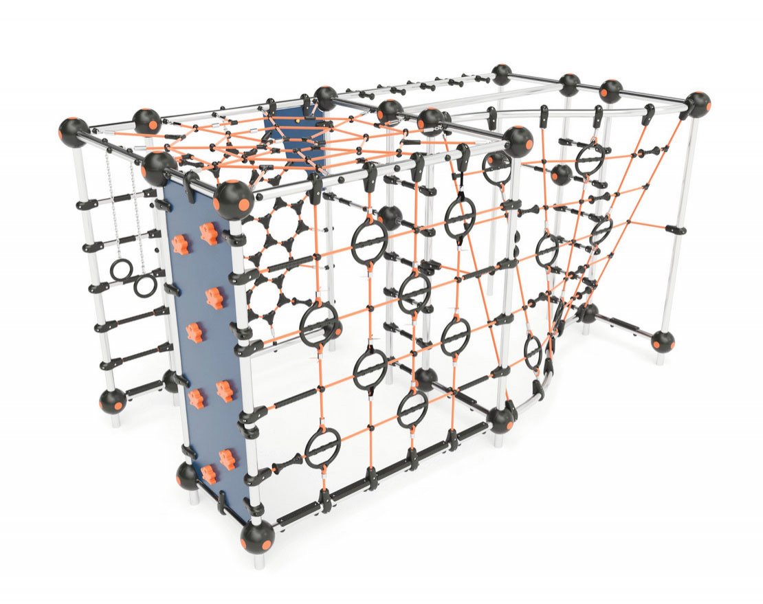Состоит из металлического каркаса, канатных сеток, скалодромных панелей, лестниц, рукоходов и гимнастических колец.