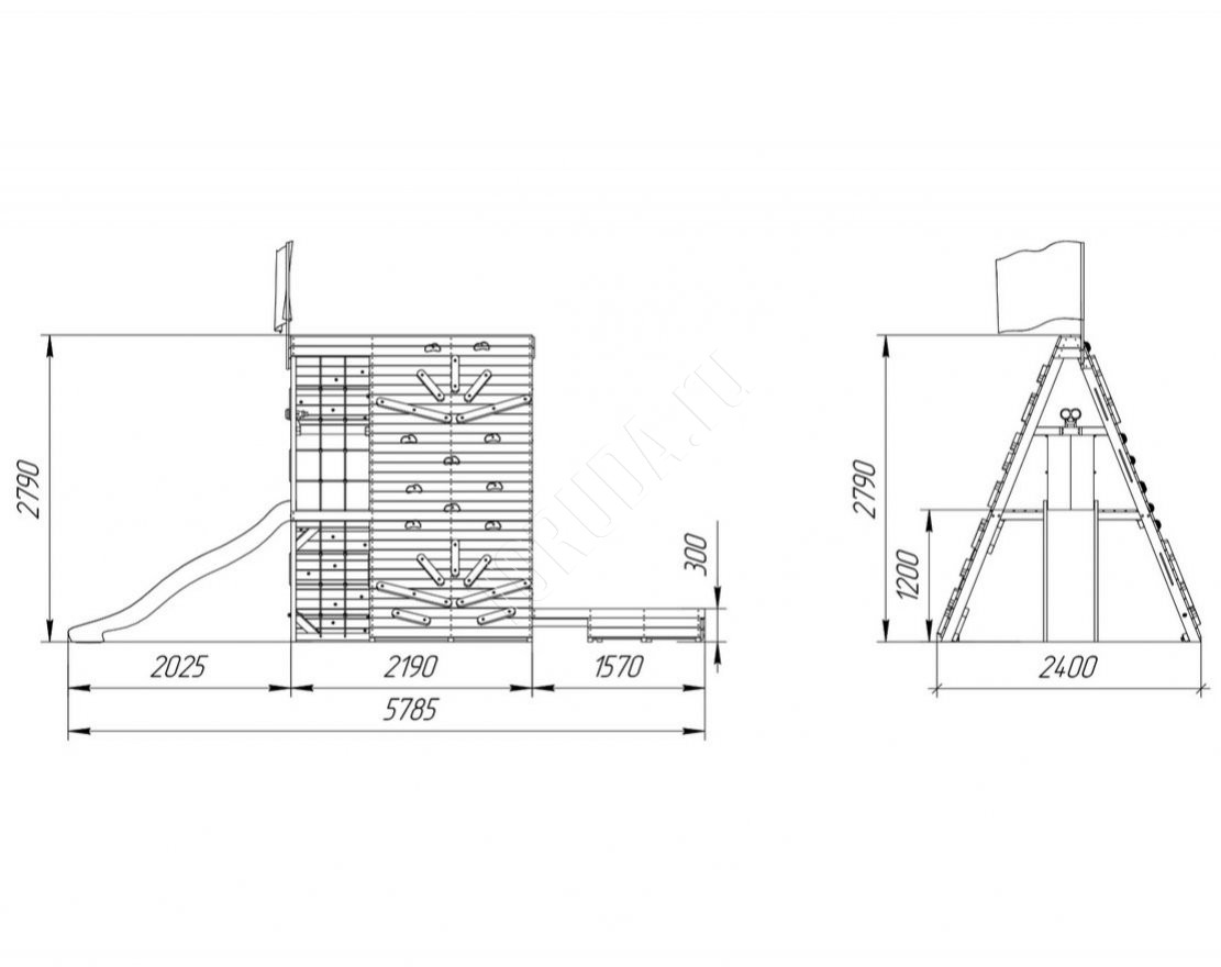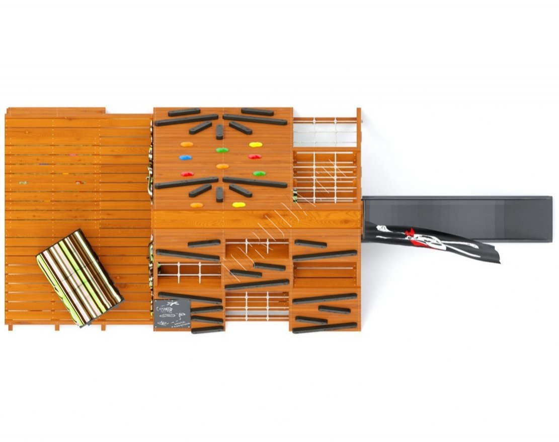 - На площадке предусмотрена горка длиной 2,2 м, платформа для спуска с горки высотой 1,2 м, внутренний лаз с лестницей с выходом на платформу и внутренняя лестница для безопасного подъема на верхний ярус.