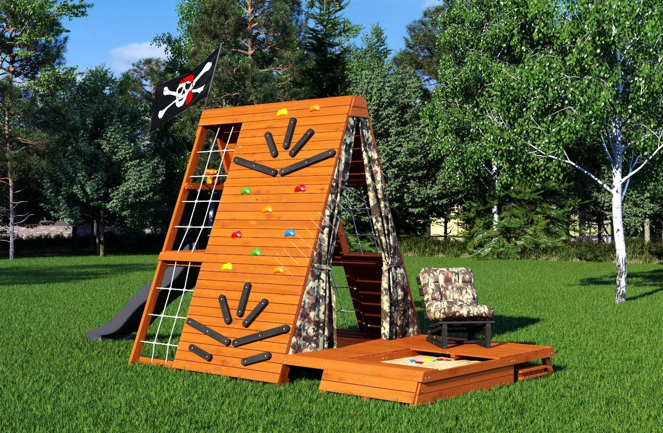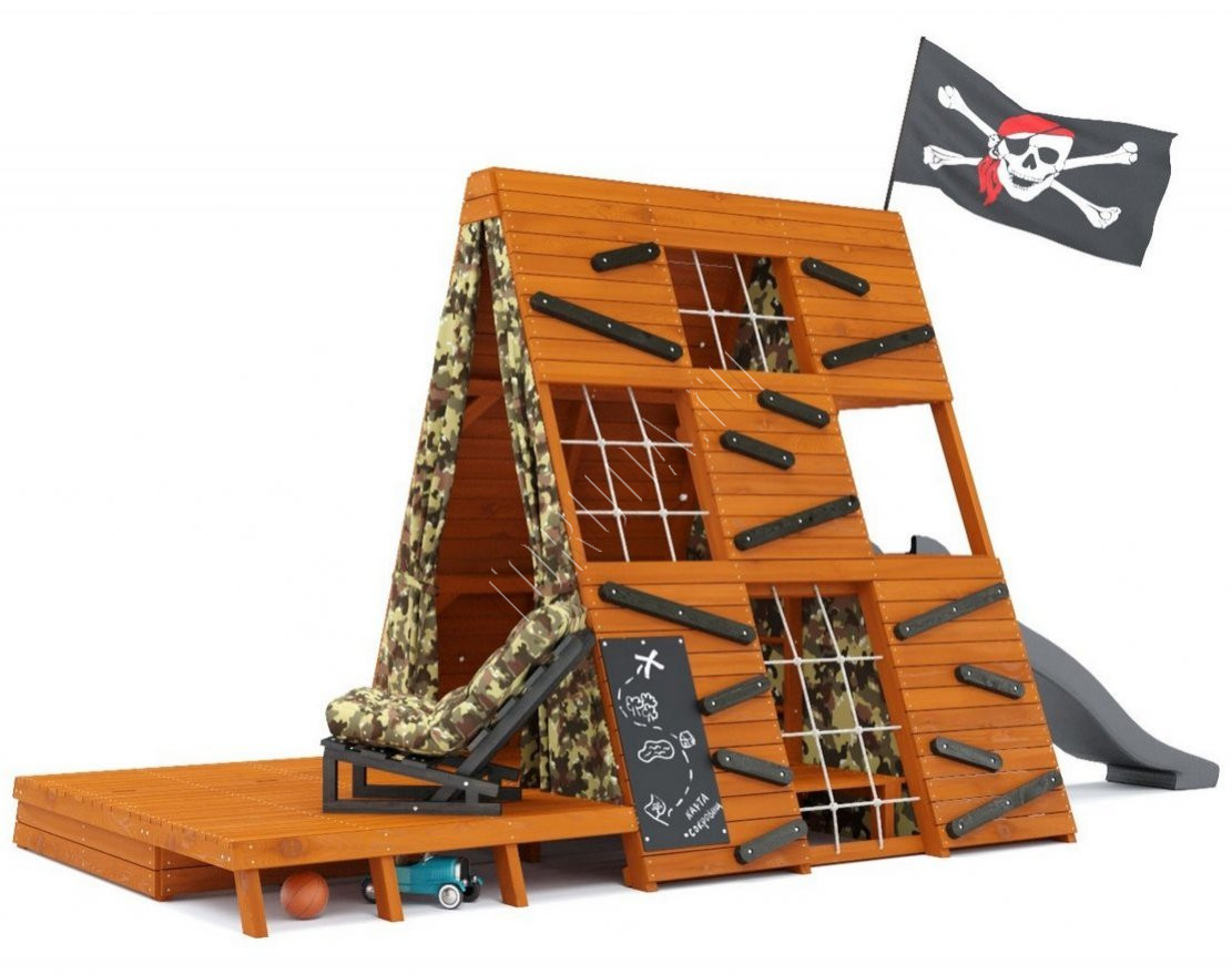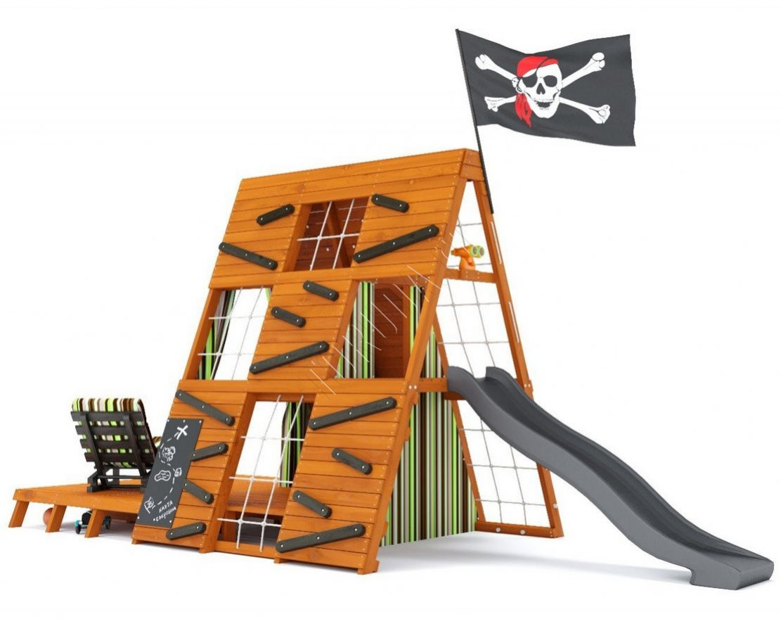 - Пиратский флаг, кресло-лежак складное с 3 положениями спинки для детей и родителей, а также подушка с фиксаторами-липучками в красивом цвете – всё это поможет детям расслабиться после активной игры и создаст неповторимую атмосферу приключений и фантазии.