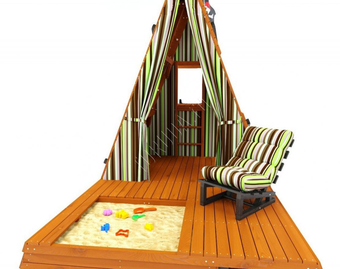 Спортивный домик – идеальное решение для тех, кто хочет обеспечить своих детей разнообразными занятиями и играми на своем дачном участке или в коттедже. Конструкция домика выполнена в виде игрового пространства со встроенной песочницей, зоной хранения игрушек и подиумом-сценой, которая может служить всемирной студией для проведения спектаклей.
