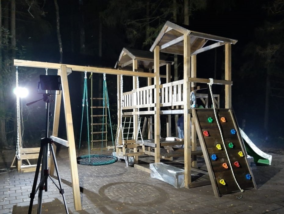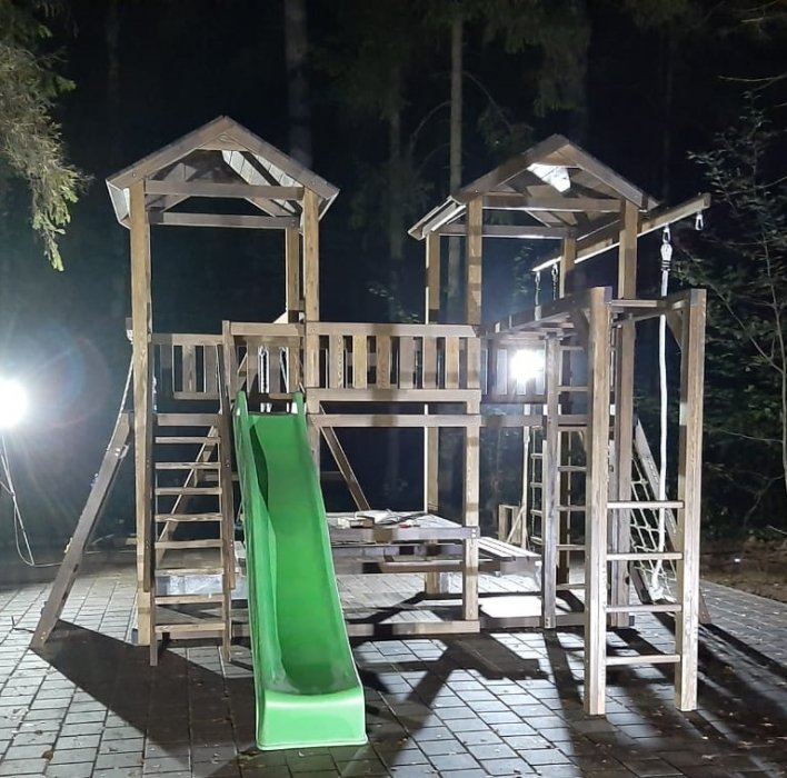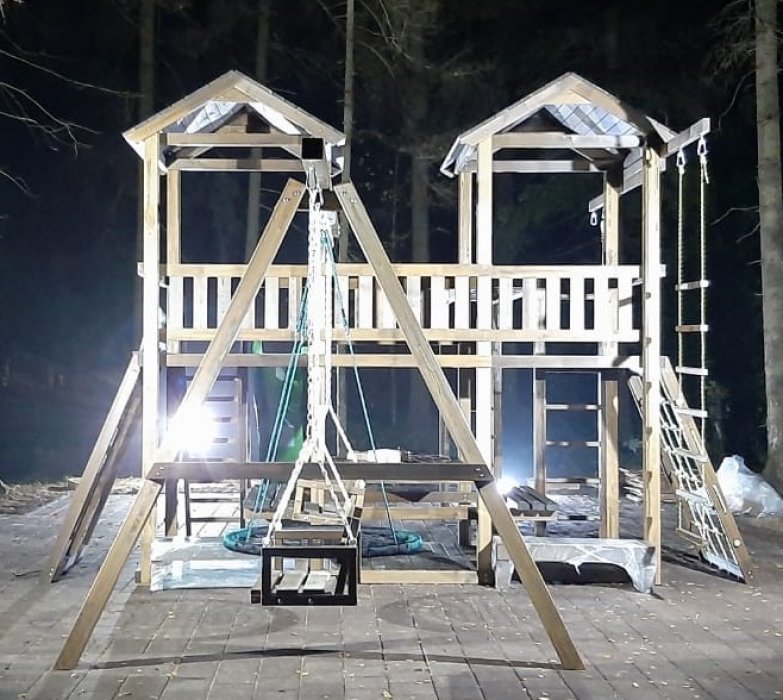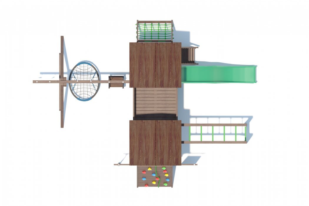Основа детской игровой - спортивной конструкции – две башни с мостиком и игровой платформой. Конструкция оснащена двумя двускатными деревянными крышами, встроенным столиком с лавками и дополнительной платформой в нижней части конструкции, пластиковым волнообразным скатом с превосходной скользящей поверхностью, деревянной лестницей, широким скалодромом, канатной лестницей, деревянным рукоходом, шведской стенкой, приставными качелями, сидением качели «гнездо», сидением качели «малютка», гимнастическими кольцами, подвесной лестницей и гимнастическим канатом. Для безопасности ребенка предусмотрены перила на лестнице, заборчики и ограждения над зонами препятствий (скалодром, канатная лестница, скат).