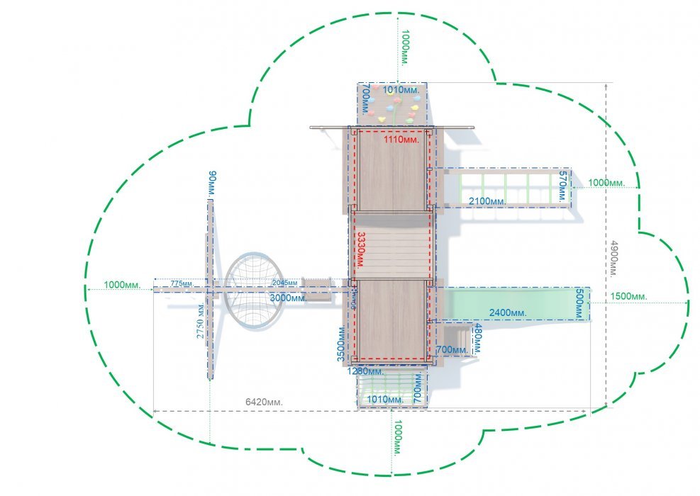 Площадь поверхности детской площадки = габариты конструкции по крайним точкам + 1000/1500мм. по периметру конструкции. Поверхность должна быть твердой, ровной, свободной от насаждений, горизонтальной без перепадов, допустимый уклон не более 20мм. на 10п.м.