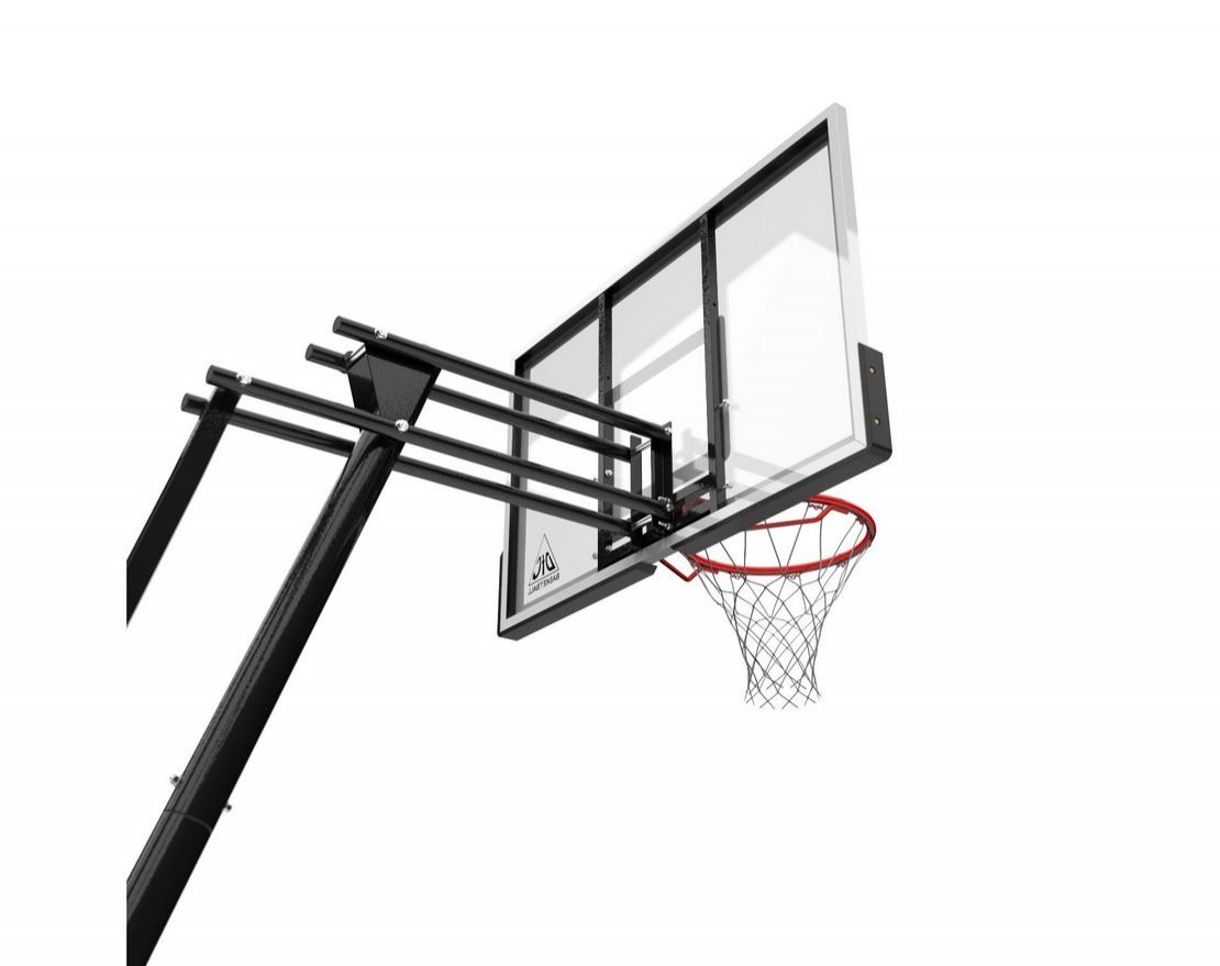 Стойка оборудована щитом из поликарбоната толщиной 4 мм. Он имеет размерность 152 х 90 см (60’’), в комплекте идет кольцо без амортизации. Регулировка высоты стойки осуществляется с помощью телескопической ручки.