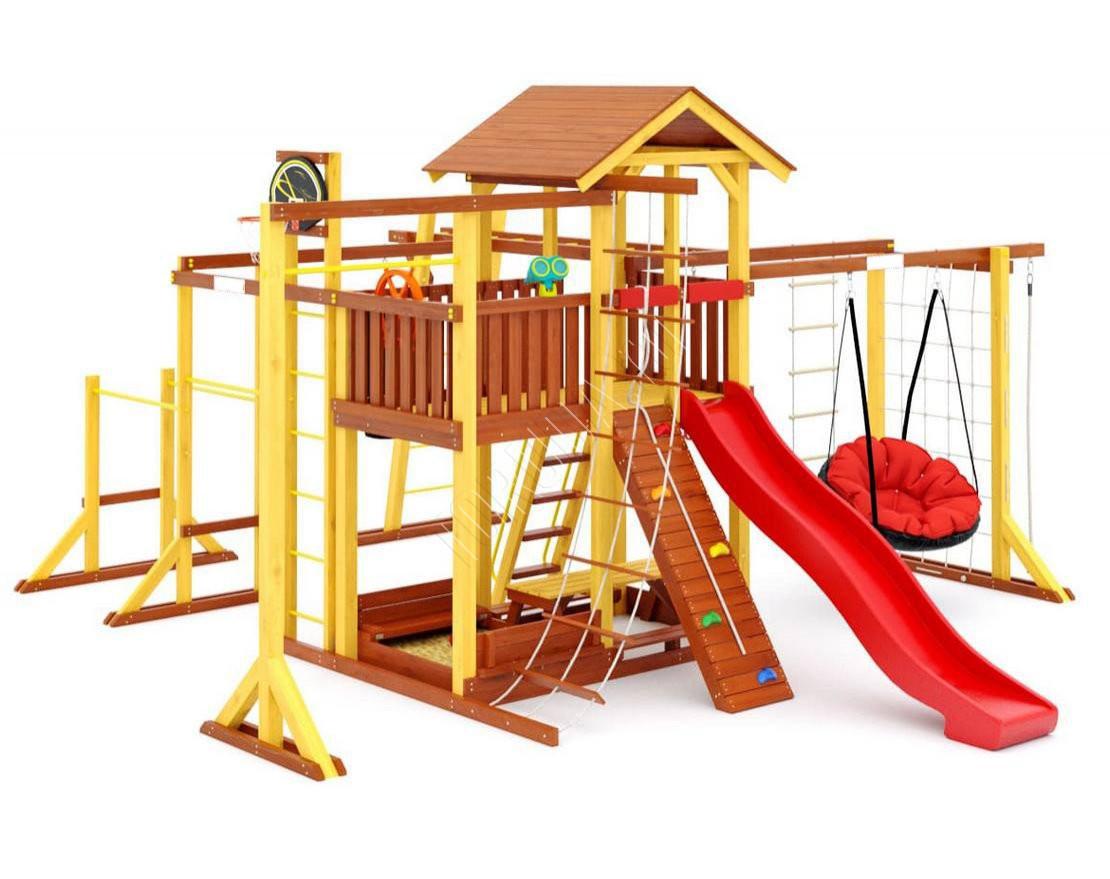 - Многообразие игровых элементов: в комплектацию входят скалодром, сетка-лазалка, турники, гимнастические кольца, песочница с крышкой, которая трансформируется в две лавочки, и многое другое.