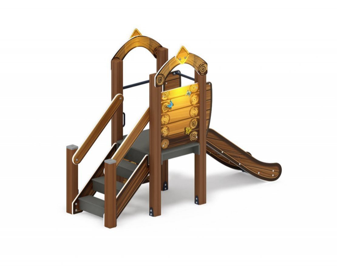 Лестница состоит из бортов, выполненных из фанеры влагостойкой толщиной 24 мм, и трех ступенек, выполненных из ламинированной анти- скользящей фанеры, толщиной 18 мм, ширина ступней 560 мм. Пространство между ступенями закрыто экранами из влагостойкой фанеры толщиной 18 мм, между ступенью и экраном имеется щель для слива дождевой воды. Ступени и экраны вставляются в пазы бортов лестницы. Борта стягиваются тремя шпильками диаметром 10 мм. Лестница поставляется в собранном виде. Лестница крепятся к двум брусьям башни и двум клееным брусьям 100х100 мм, брус окрашен в коричневый цвет, высота 800 мм (2 шт).