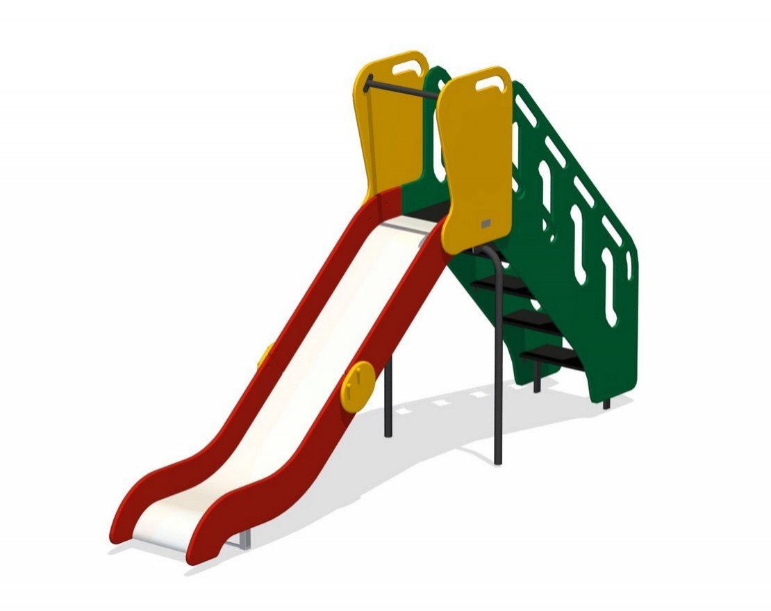 Горка, может служить элементом детского комплекса для дачи и представляет собой сборноразборную конструкцию, состоящую из одной площадки, двух перил, трех ступеней, трех профильных турников, опоры для бетонирования, одного ската горки с высотой стартового участка 1250мм, крепежного турника, двух стоек, двух ограждений стартовой площадки и распорного турника-ограничителя Оборудование устанавливается и бетонируется в грунт. Возраст пользователя от 7 лет.