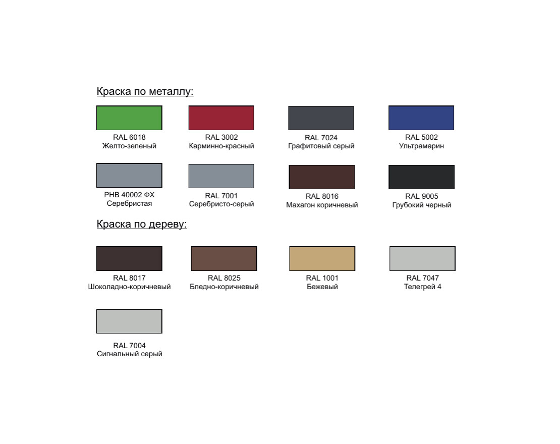 Изделия из металла имеют плавные радиусы закругления и тщательную обработку швов. Для покрытия изделий из стали используется экологически чистое, обладающее хорошей устойчивостью к старению в атмосферных условиях, стабильностью цвета антикоррозийное, выдерживающее широкий диапазон температур, двойное порошковое окрашивание.