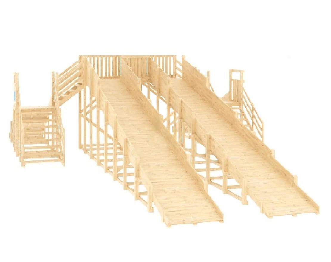 - Представленная деревянная горка отличается высоким уровнем функциональности. В своей комплектации она имеет два больших ската по 10,0 м – они предназначены для детей старшего возраста и взрослых. Два маленьких ската по 4,0 м – идеальны для детей дошкольного и младшего школьного возраста.