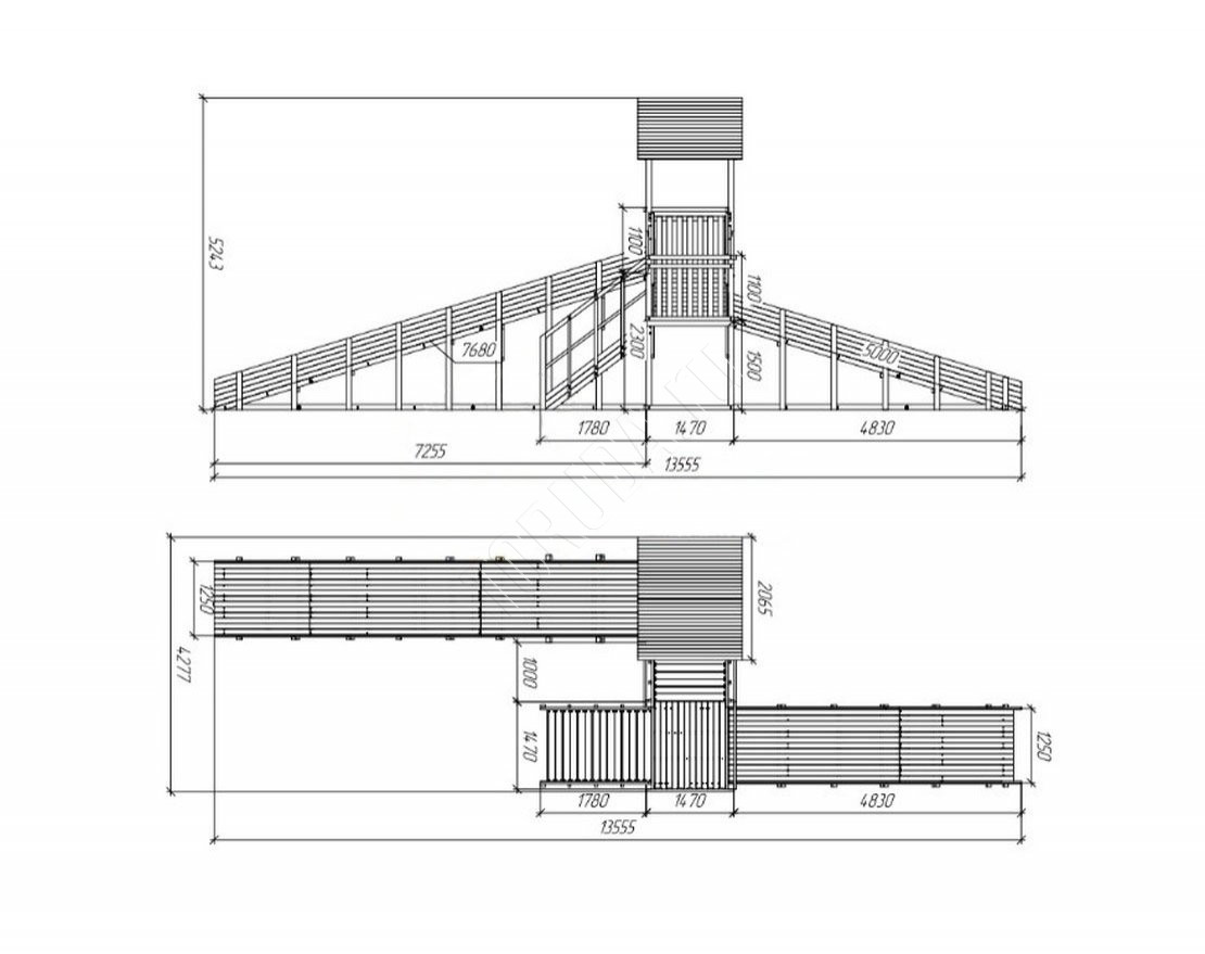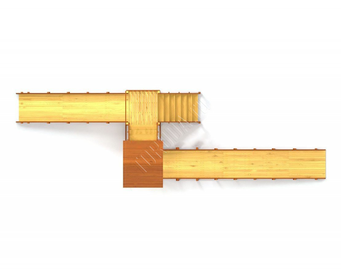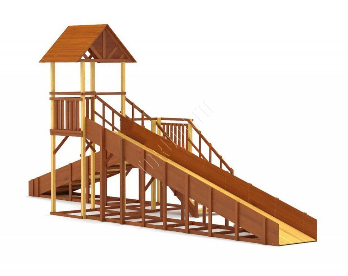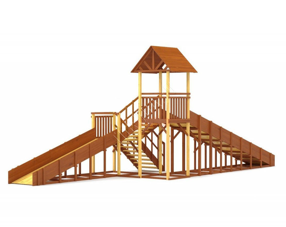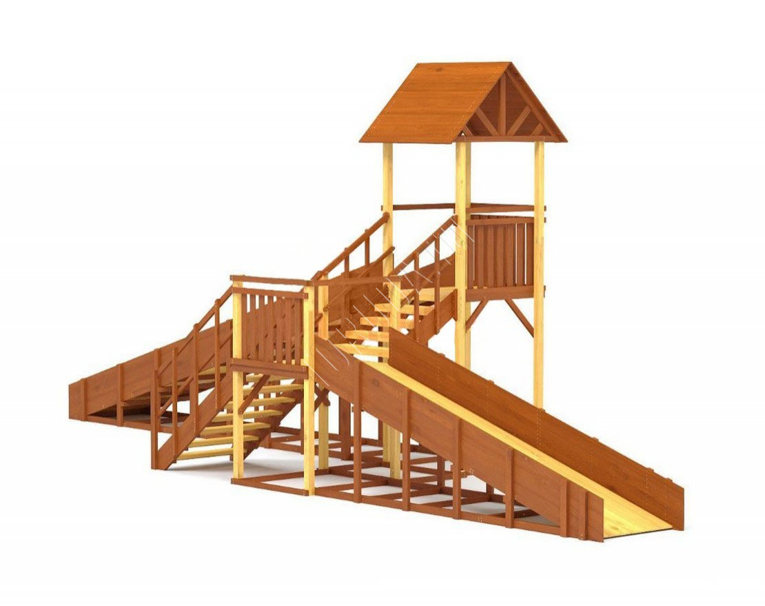 Большое внимание уделено деталям: углы имеют скругления, болты и другие крепежные элементы спрятаны под заглушками. Продуманная конструкция ступеней, высокие перила и страховочные ограждения делают площадки удобными и безопасными.