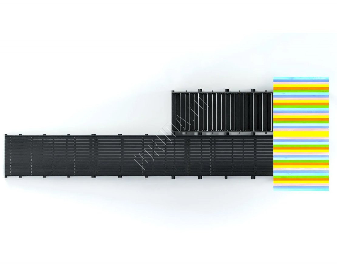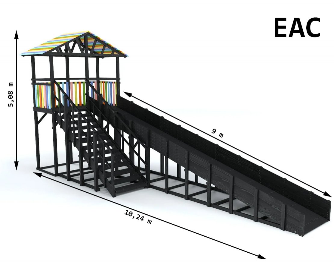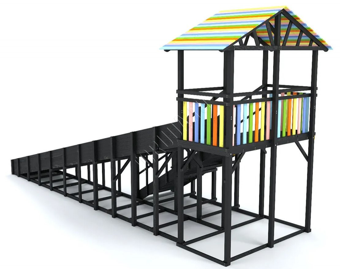 Конструкция надёжна и устойчива, выполнена из клееного бруса сечением 90×90 мм. Все поверхности тщательно шлифуются, углы скруглены, а бортики и прочные перила обеспечивают максимальную безопасность.