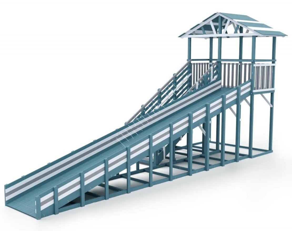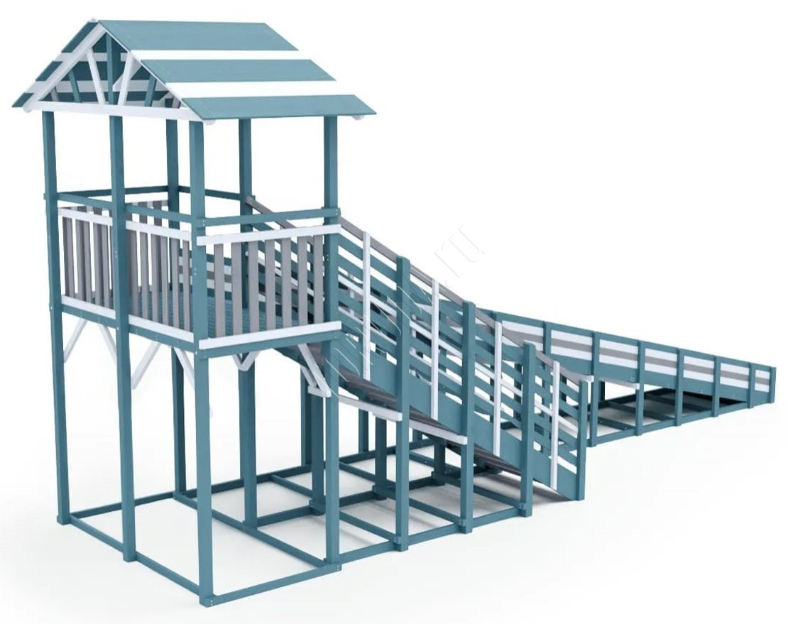 Конструкция надёжна и устойчива, выполнена из клееного бруса сечением 90×90 мм. Все поверхности тщательно шлифуются, углы скруглены, а бортики и прочные перила обеспечивают максимальную безопасность.