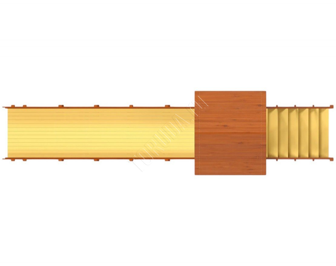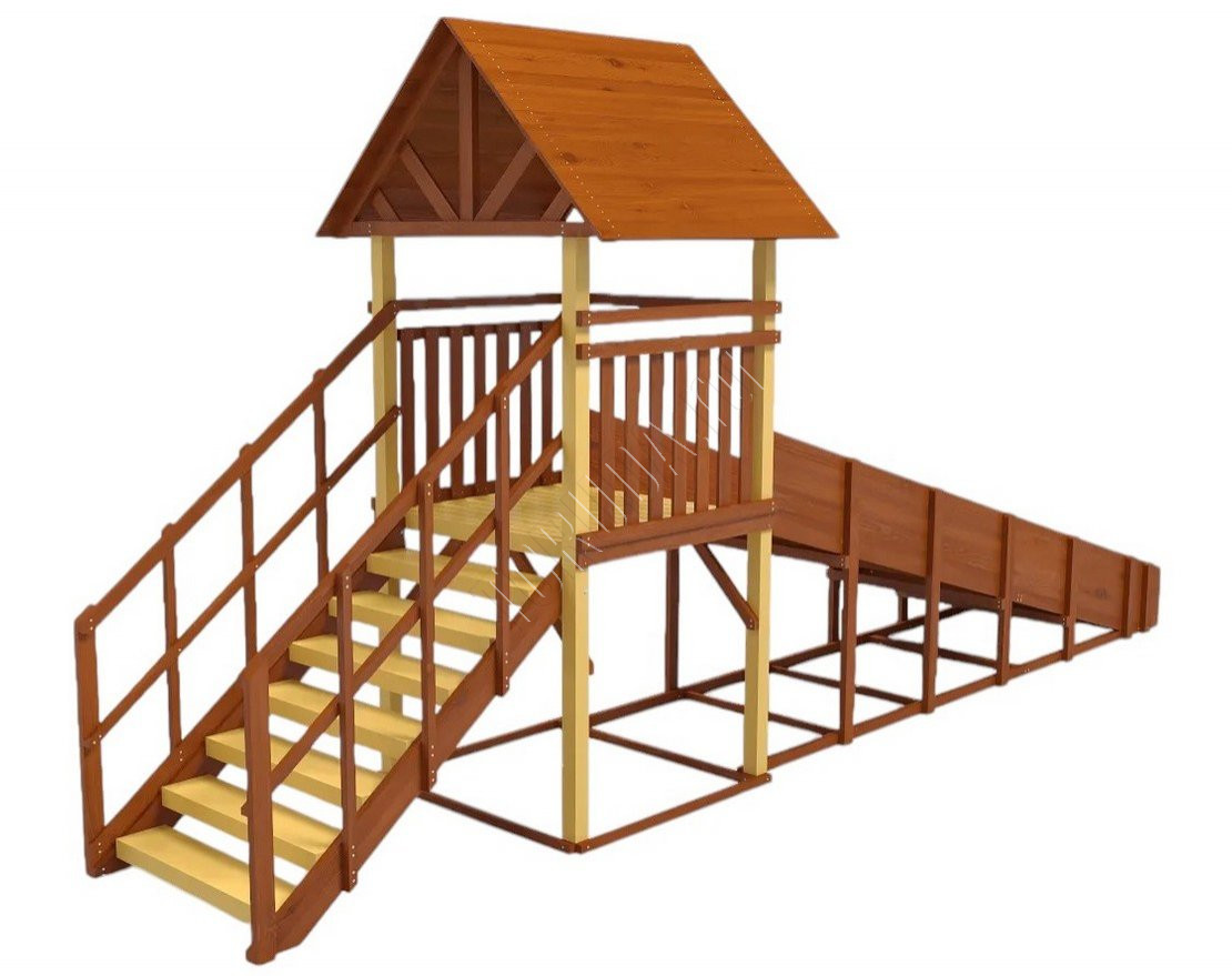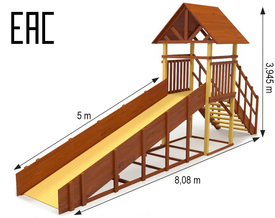 Силовые детали конструкций производены из крепкого клееного бруса с квадратным сечением (сторона 90 мм). Дерево покрыто натуральной краской на водной основе, которая выдерживает перепады температур и при этом абсолютно безопасна для малышей.