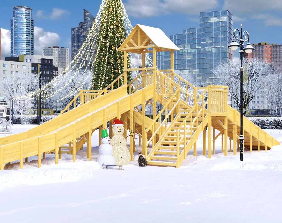 Деревянная зимняя горка «TORUDA Север Wood»-11 – это просторный неокрашенный игровой комплекс с тремя скатами, который станет центром зимних забав. Прочный каркас из клееного бруса гарантирует безопасность и долговечность.