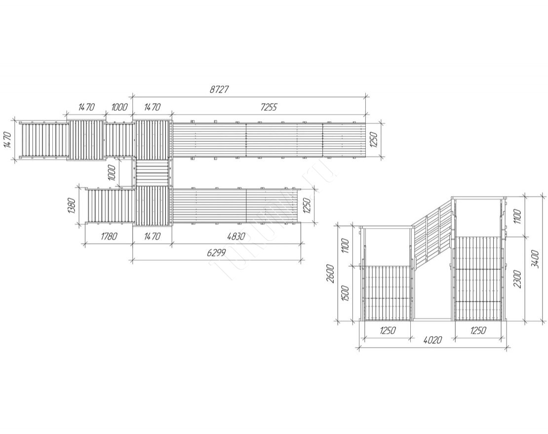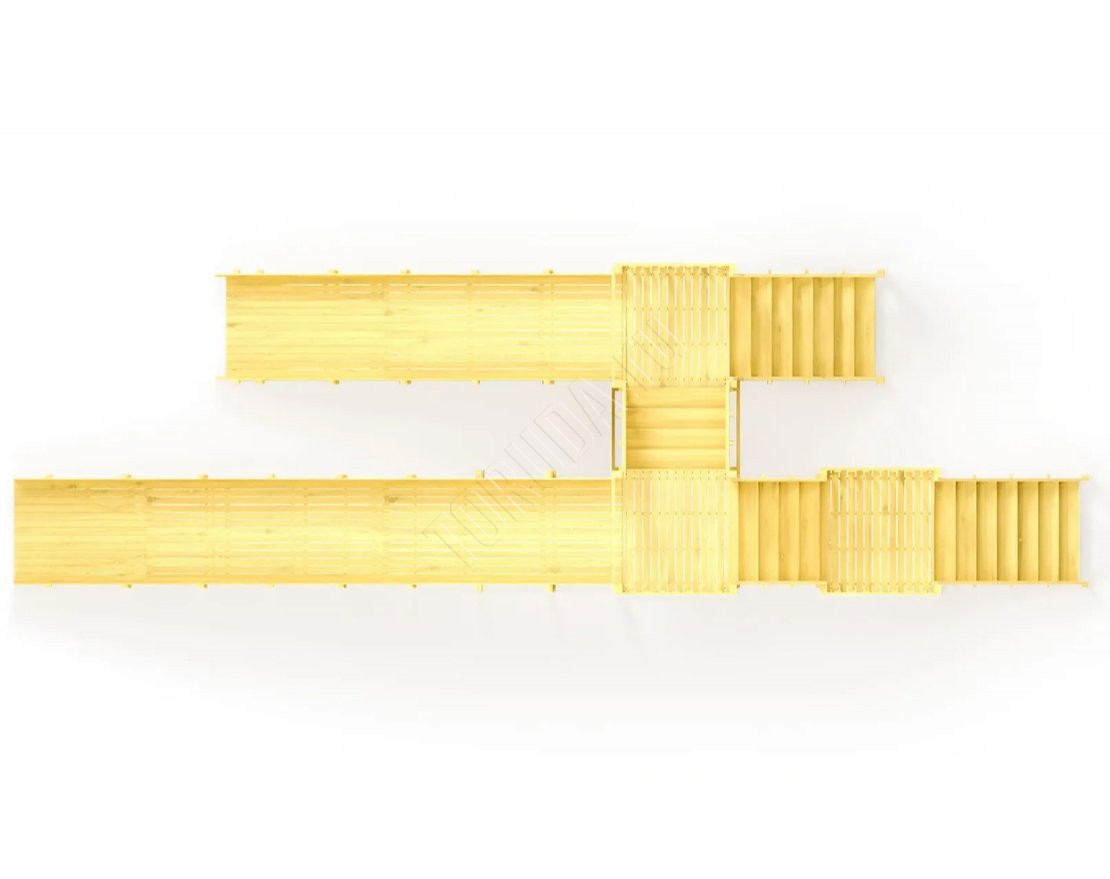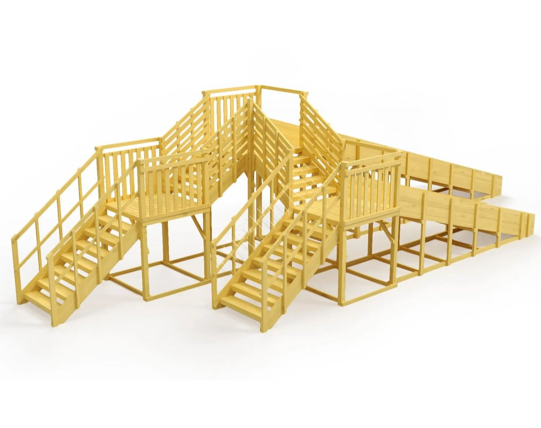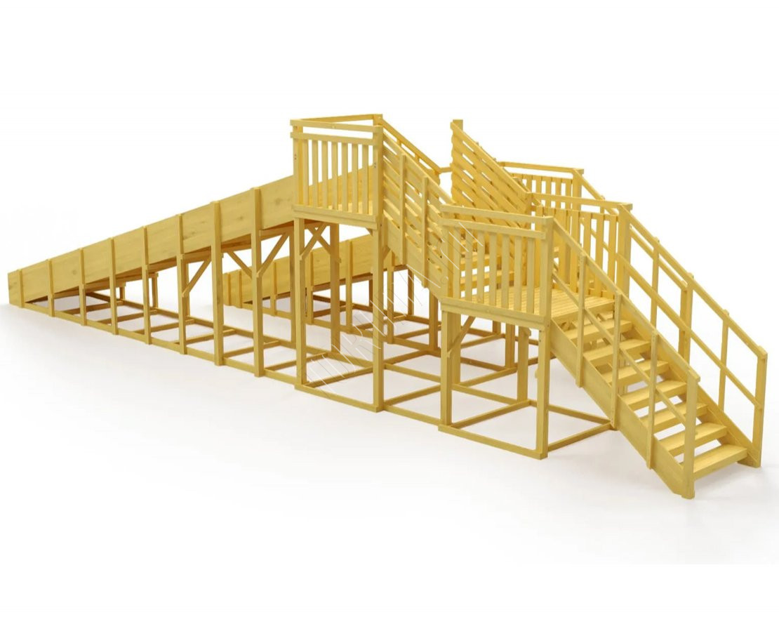 Многоуровневая конструкция с двумя длинными скатами (5 и 7,68 м). Прочный клееный брус делает горку надежной и долговечной.
