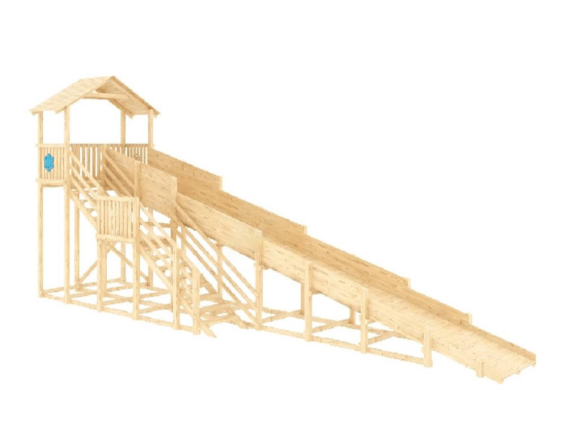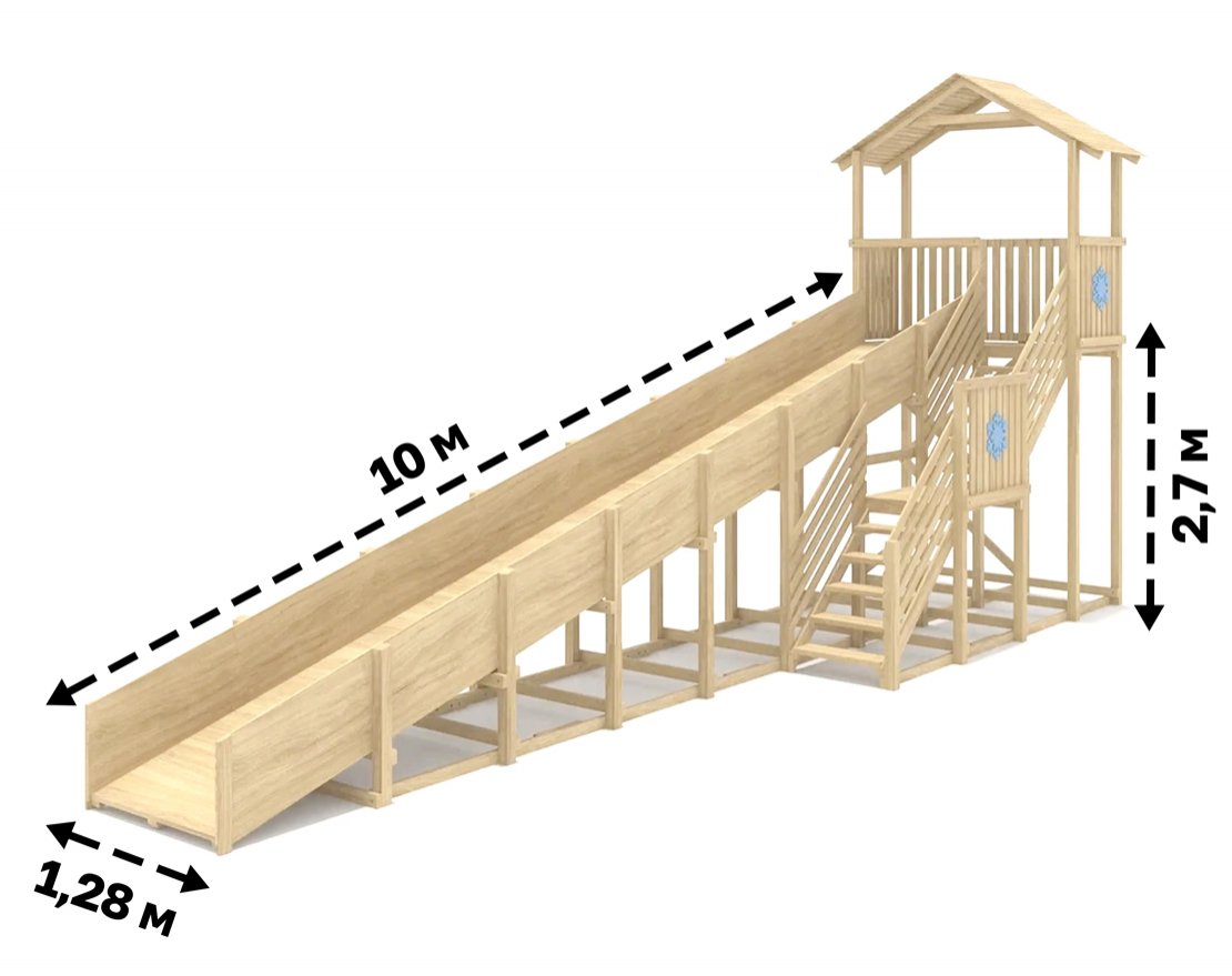 10-ти метровый скат безопасен для катания детей дошкольного возраста, потому что он имеет оптимальную высоту. Дети могут подниматься вверх по удобной лестнице, держась за перила. Площадка в верхней части достаточно просторная и оборудована деревянной крышей. Она позволит ребятам укрыться от обильных осадков, ветра, весело общаясь друг с другом.