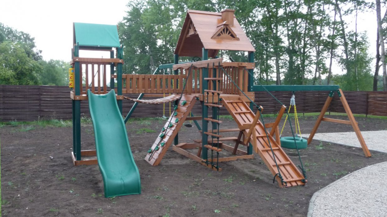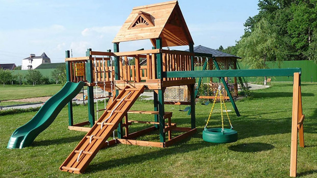 Большой игровой комплекс из дерева Гигант 1 состоит из двух фортов с переходным мостиком между ними, двух перекладин для качелей и горки. Дерево пропитано экологичным защитным составом от гниения и насекомых. Площадка рассчитана на детей в возрасте 3 — 11 лет. Даже самые активные малыши не смогут получить травмы во время игр, ведь детская площадка оборудована широким безопасным трапом с верёвочными поручнями, а все крепления и опоры отличаются повышенной прочностью.