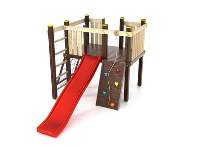 Для максимальной защиты ребёнка от травм, все углы имеют закруглённую форму, крепеж скрыт пластиковыми заглушками. Опоры изготовлены из клеёного бруса толщиной 90*90 мм. Изделие покрыто безопасной для детей высокоустойчивой краской на водной основе, которая надежно защищает древесину от воздействия окружающей среды. Перила, скалодром и лестница производятся по системе "шип паз".