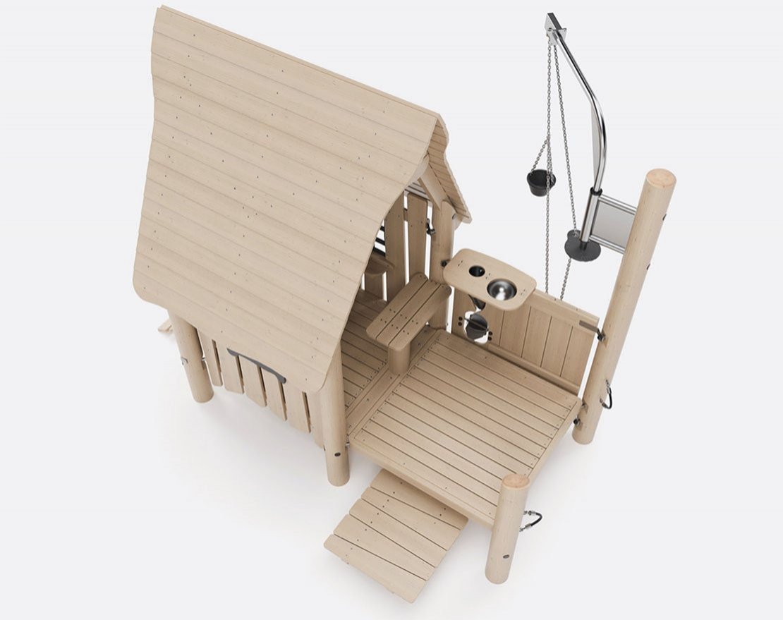 Состоит из опорных стоек, домика и панели, предназначенной для игр с водой и песком. Панель оснащена металлическими ковшами, чашами, резиновыми ведрами и мельницами для песка. Для большего комфорта, в конструкции установлены ручки-стропы.