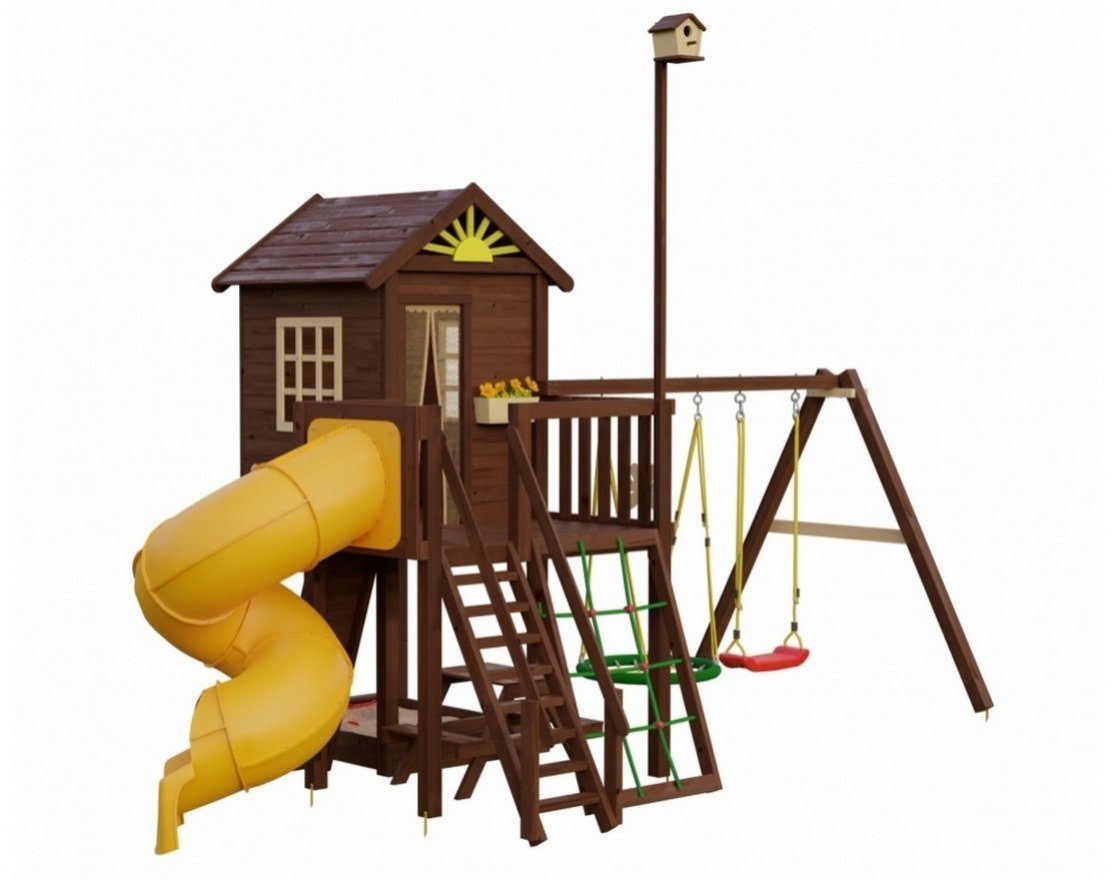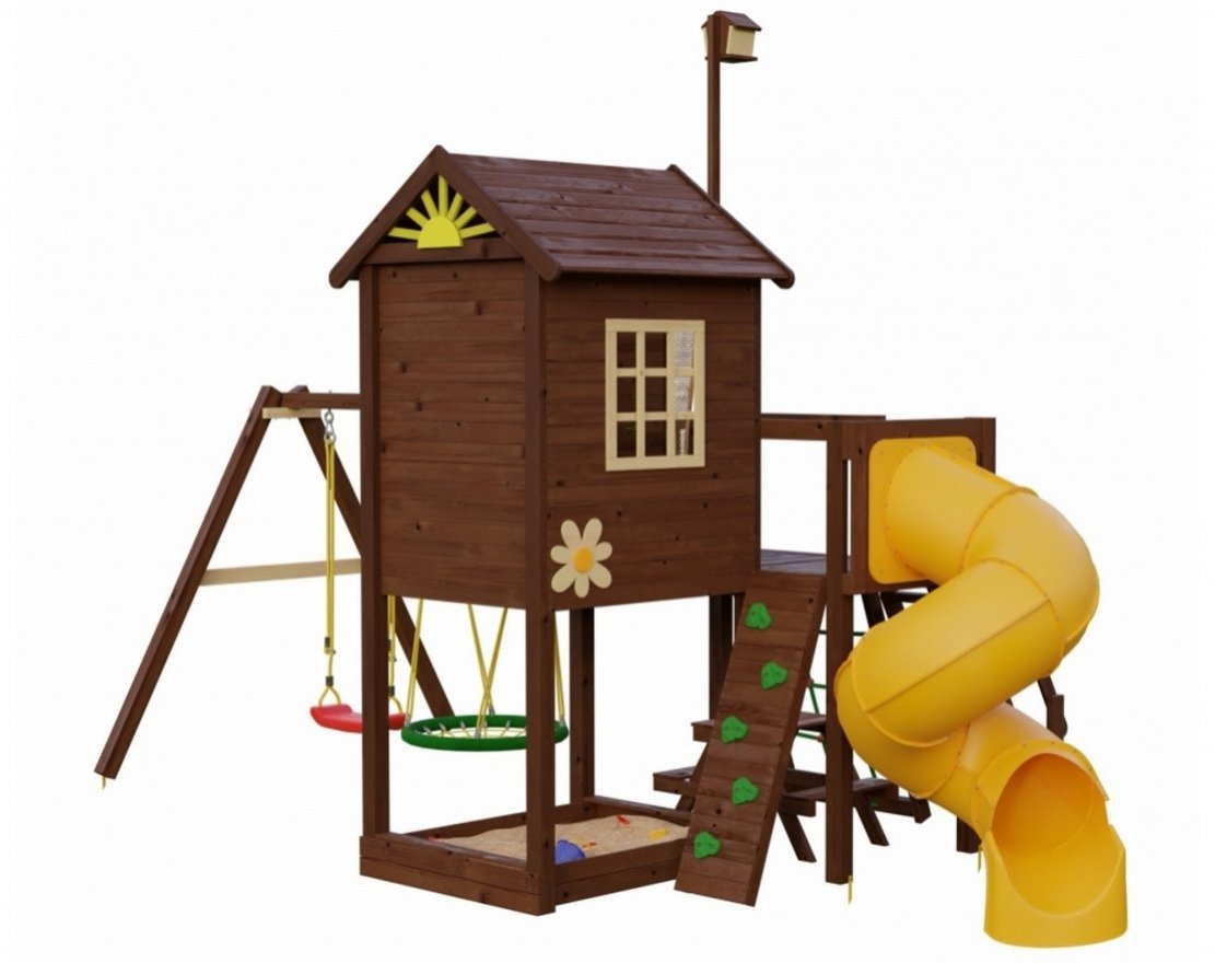 Отличительной особенностью игровых домиков серии Индиана является фирменный элемент "солнышко" на крыше, декоративные ромашки, а также наличие скворечника, возвышающегося над всей конструкцией.