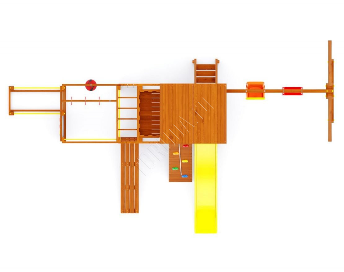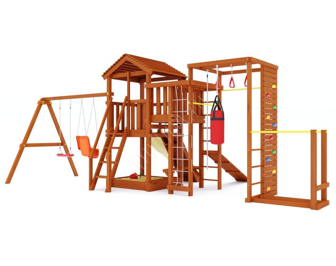 Высокая прочность конструкции и использование материалов высокого качества делают этот комплекс очень долговечным и безопасным. Вся древесина проходит качественную обработку и имеет сертификат безопасности. Металлические детали комплекса усилены, а качельный подвес из оцинкованной стали не будет ржаветь во время эксплуатации. Установленные не снимаемые пластиковые заглушки делают комплекс безопасным и аккуратным внешне.