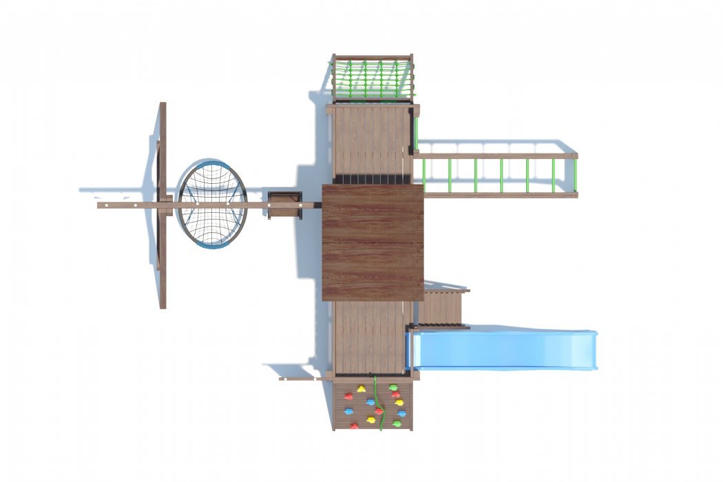 Основа детской игровой - спортивной конструкции - башня с террасой и игровой платформой. Конструкция оснащена двускатной деревянной крышей, пластиковым волнообразным скатом с превосходной скользящей поверхностью, деревянной лестницей, широким скалодромом, канатной лестницей, деревянным рукоходом, шведской стенкой, приставными качелями, сидением качели «гнездо», сидением качели «малютка», гимнастическими кольцами, подвесной лестницей. Для безопасности ребенка предусмотрены перила на лестнице, заборчики и ограждения над зонами препятствий (скалодром, канатная лестница, скат).