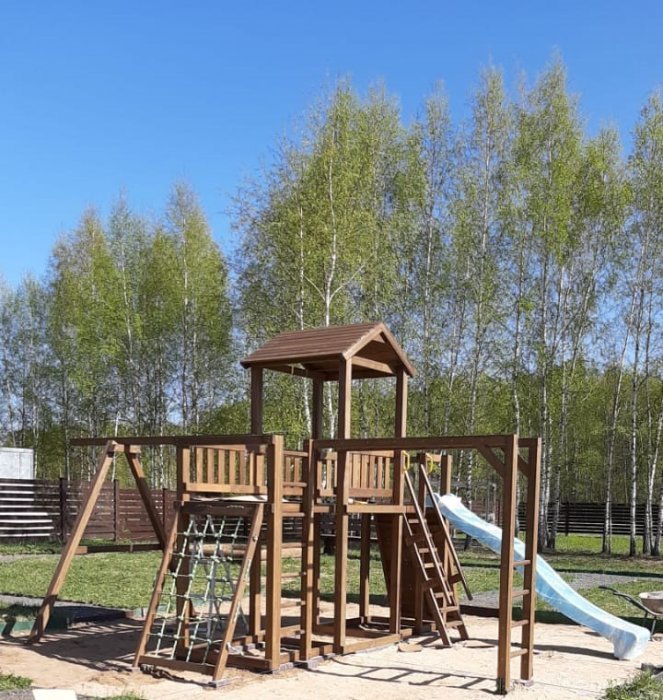 Надежная и долговечная детская игровая - спортивная конструкция из древесины сибирской лиственницы для детской площадки в дачных домовладениях, загородных участках и поместьях (только частные владения, для личного пользования), поможет организовать интересный досуг детям в условиях загородной жизни и отлично сочетается с природным ландшафтом. Конструкция не предназначена для установки и эксплуатации в зонах общего пользования: городские дворы, городские парки, общедоступные детские игровые площадки.