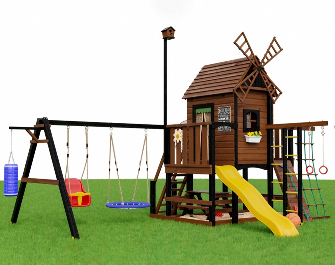 Игровой комплекс Мулен 2 — это уютный деревянный домик, наполненный атмосферой приключений. Его узнаваемый силуэт с декоративными лопастями на крыше перенесет детей в мир сказок, где можно представить себя отважным путешественником, хозяином мельницы или капитаном воздушного корабля. Площадка сочетает различные игровые и спортивные элементы, помогая ребенку развивать ловкость, силу и координацию. Лестницы, канаты, качели и горка превращают игру в увлекательное приключение, в котором важно не только фантазировать, но и двигаться. Внутри домика продумано всё до мелочей — каждый уголок наполнен возможностями для игры, творчества и удобства. На втором этаже маленьких художников ждет доска для рисования, где можно воплощать свои фантазии. Два отдельных столика со стульчиками позволяют детям играть, рисовать или устраивать чаепитие, не мешая друг другу. А просторная песочница под домиком станет местом для совместных экспериментов с песочными замками — здесь хватит места всем! Два раздельных входа делают пространство более просторным и удобным, создавая еще больше возможностей для веселой и динамичной игры.