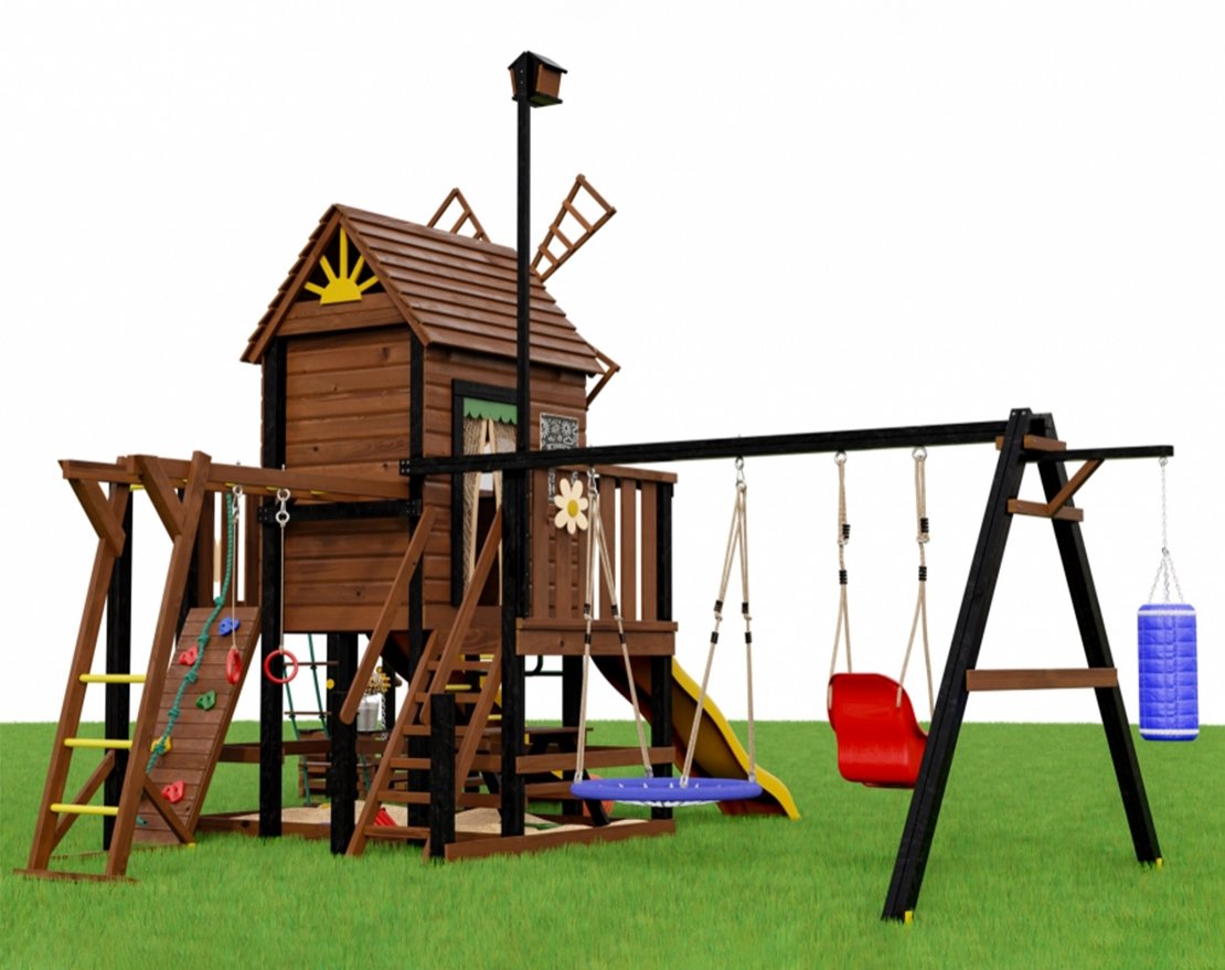 Игровой комплекс Мулен 3 с колодцем — это уютный деревянный домик, наполненный атмосферой приключений. Его узнаваемый силуэт с декоративными лопастями на крыше перенесет детей в мир сказок, где можно представить себя отважным путешественником, хозяином мельницы или капитаном воздушного корабля. Площадка сочетает различные игровые и спортивные элементы, помогая ребенку развивать ловкость, силу и координацию. Лестницы, канаты, качели и горка превращают игру в увлекательное приключение, в котором важно не только фантазировать, но и двигаться. Внутри домика продумано всё до мелочей — каждый уголок наполнен возможностями для игры, творчества и удобства. На втором этаже маленьких художников ждет доска для рисования, где можно воплощать свои фантазии. Два отдельных столика со стульчиками позволяют детям играть, рисовать или устраивать чаепитие, не мешая друг другу. А просторная песочница под домиком станет местом для совместных экспериментов с песочными замками — здесь хватит места всем! Два раздельных входа делают пространство более просторным и удобным, создавая еще больше возможностей для веселой и динамичной игры.