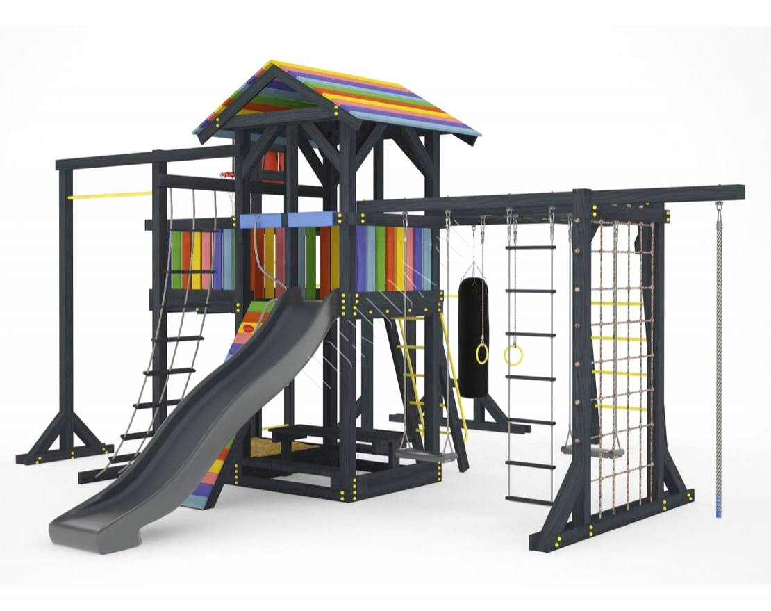 Детская площадка обладает довольно широким функционалом, предназначена для дачи, коттеджа.