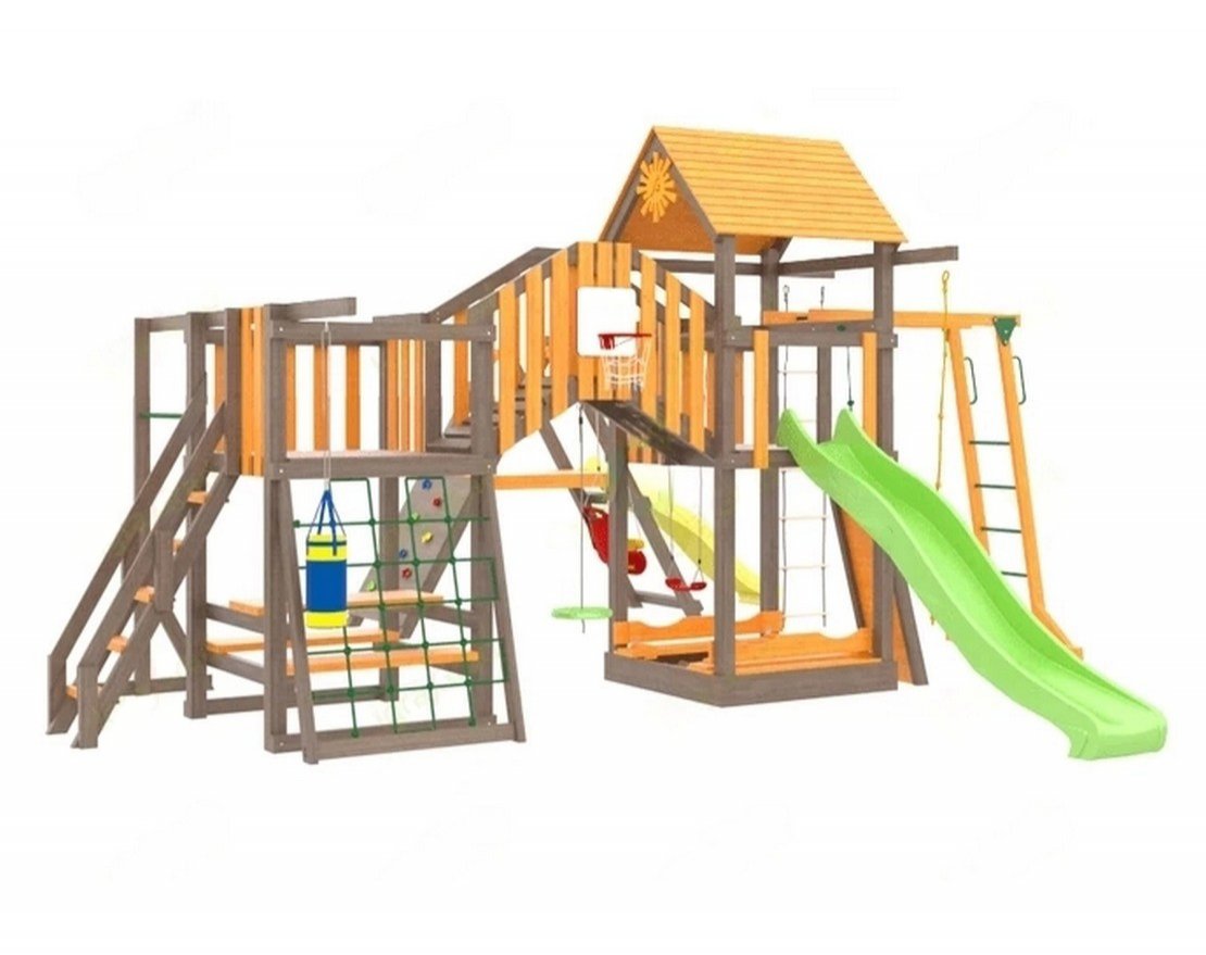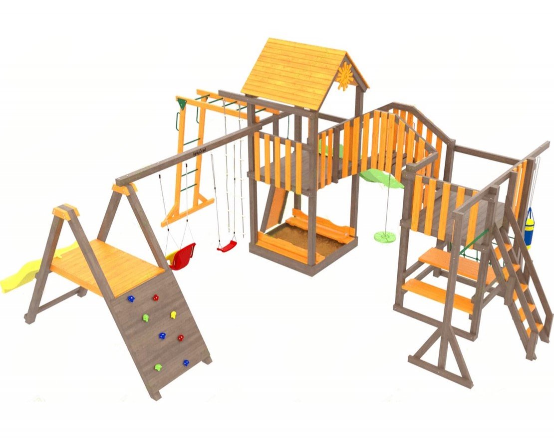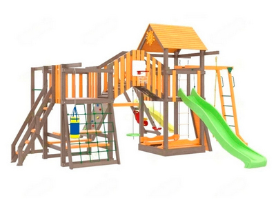 - Функциональность. Конструкция оснащена разными видами спортивно-игровых атрибутов, начиная от песочницы и заканчивая боксерской грушей. Это говорит о том, что дети от мала до велика могут проводить время на этой площадке, не мешая друг другу.