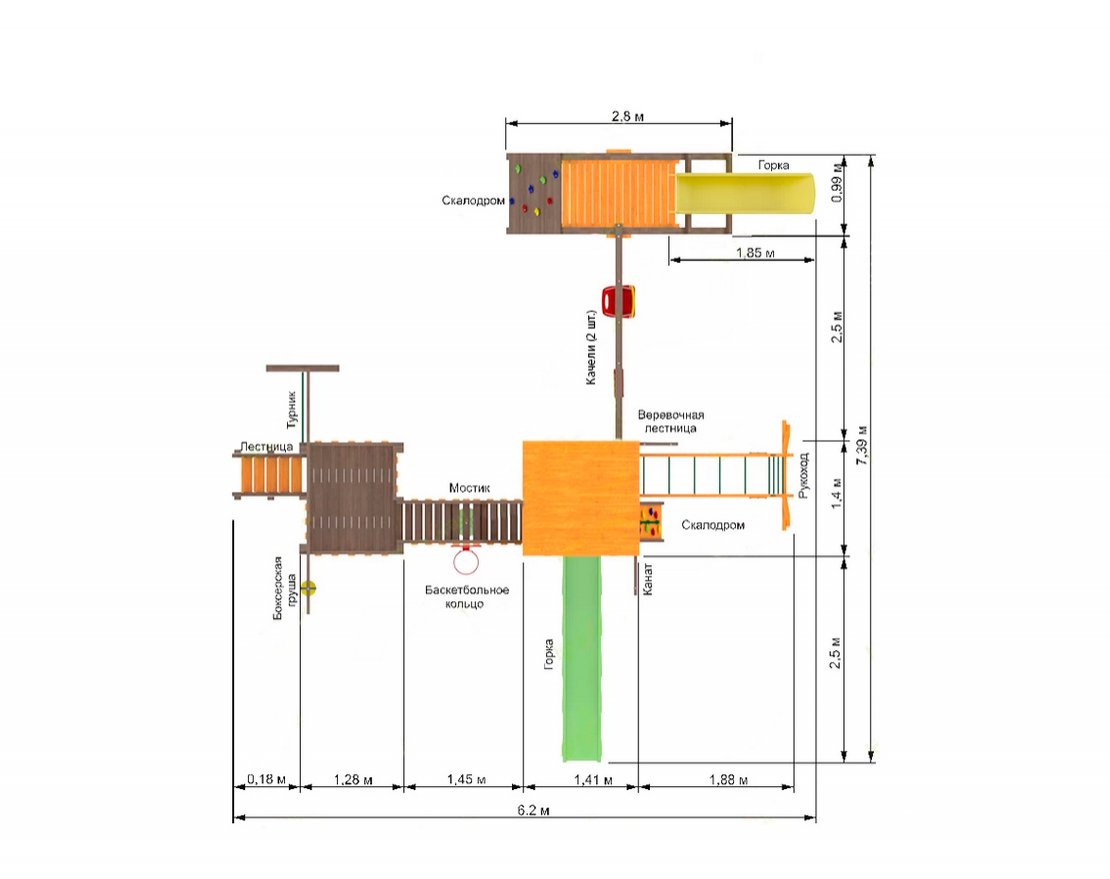 Габариты игрового комплекса имеют длину 7,48 м, высоту 3,25 м, ширина составляет 6,2 м. Детская площадка представляет собой высокую башню с крышей, оборудованную со всех сторон спортивно-игровыми атрибутами: двумя волновыми горками, скалодромом, канатом, качелями для детей дошкольного и младшего школьного возраста, верёвочной лестницей и сеткой, деревянной лестницей, боксёрской грушей, баскетбольным кольцом, рукоходом, турником.