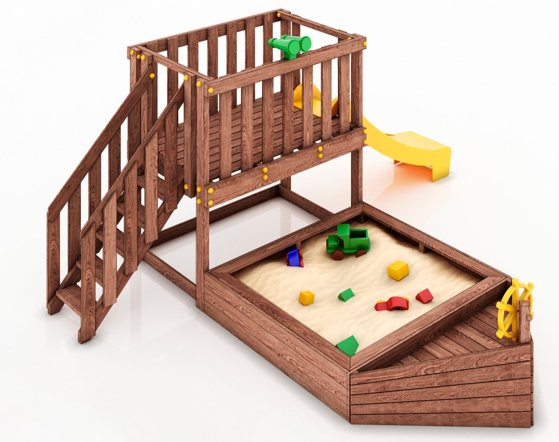 Детская песочница-кораблик и капитанский мостик с горкой с высоты 900 мм.