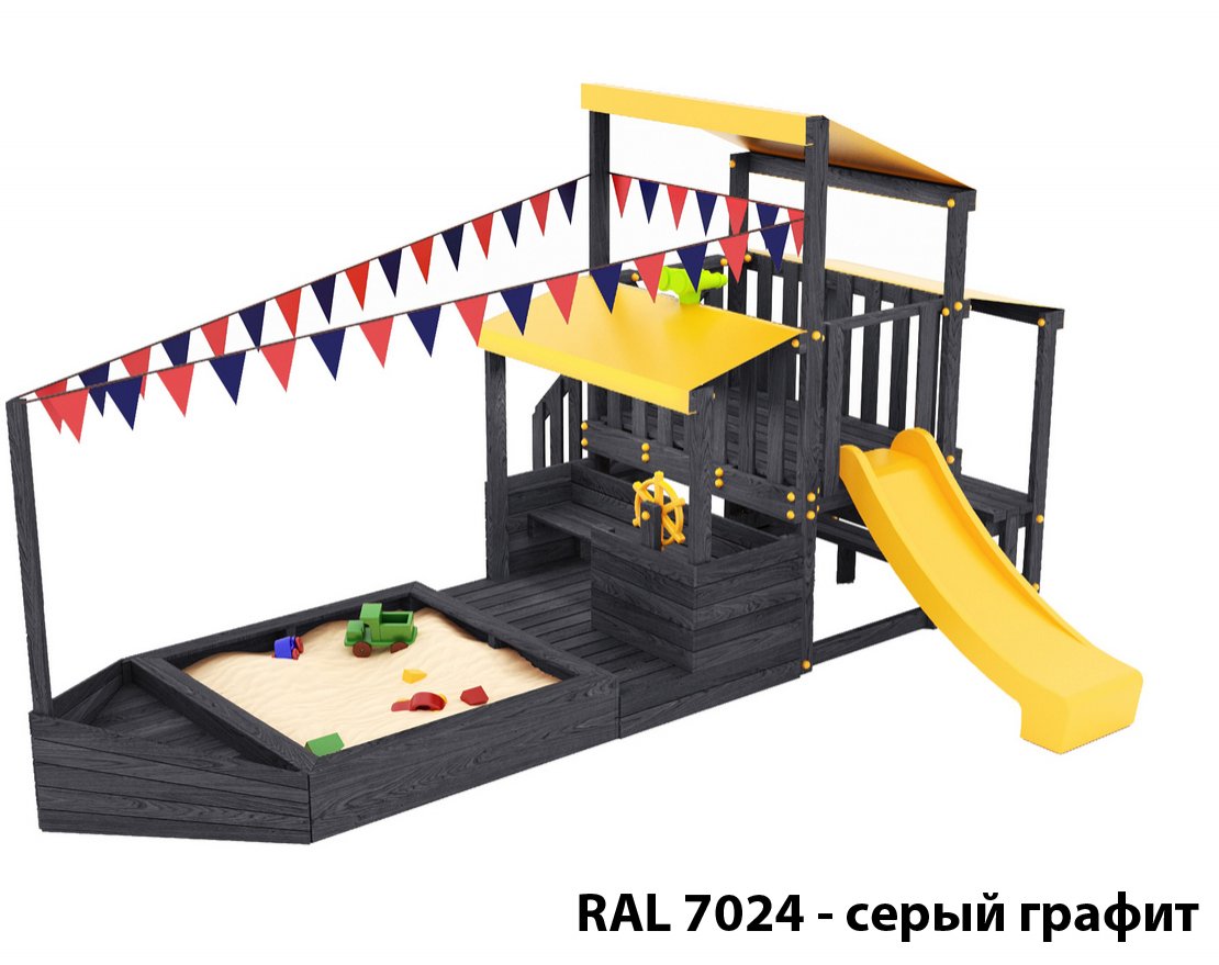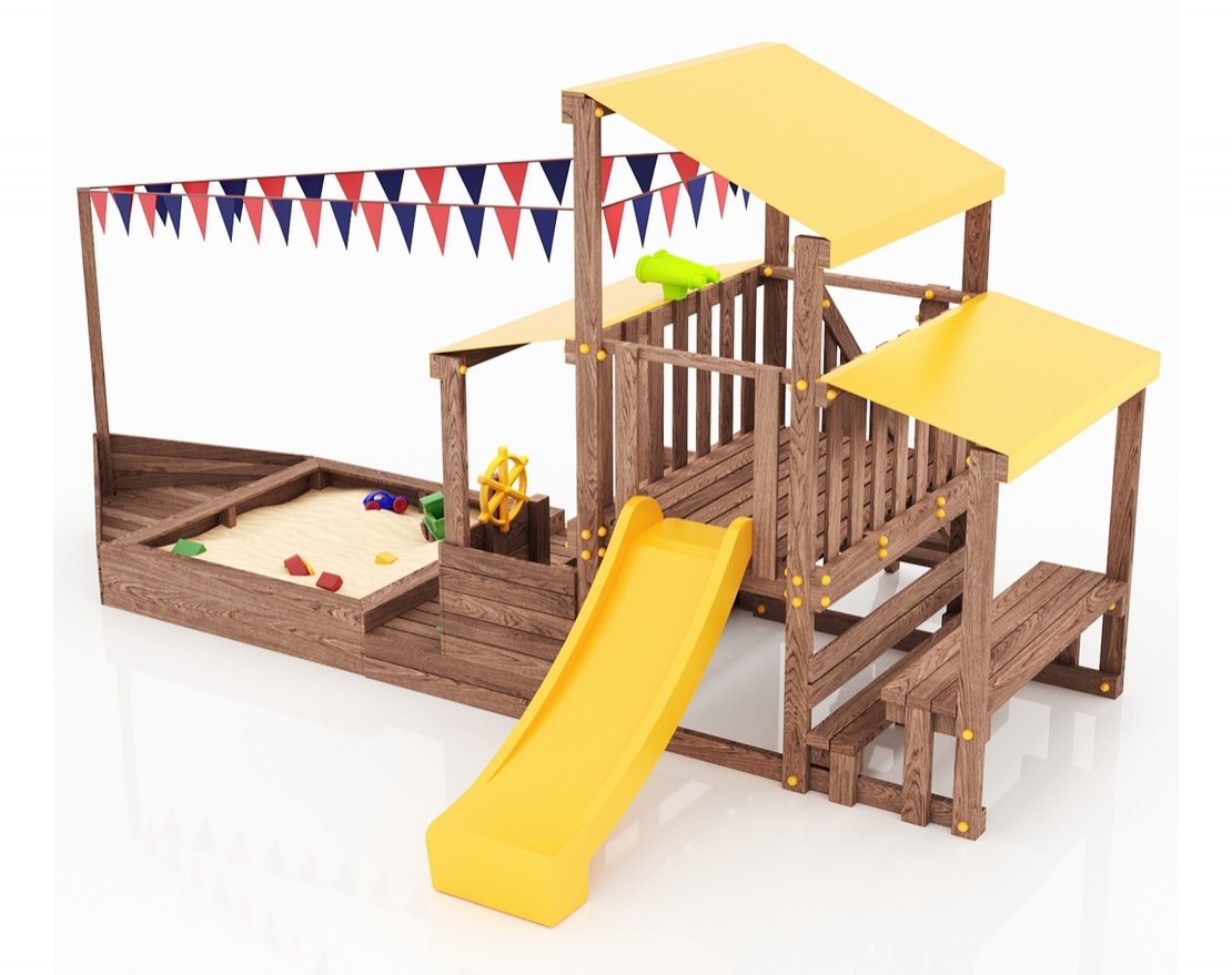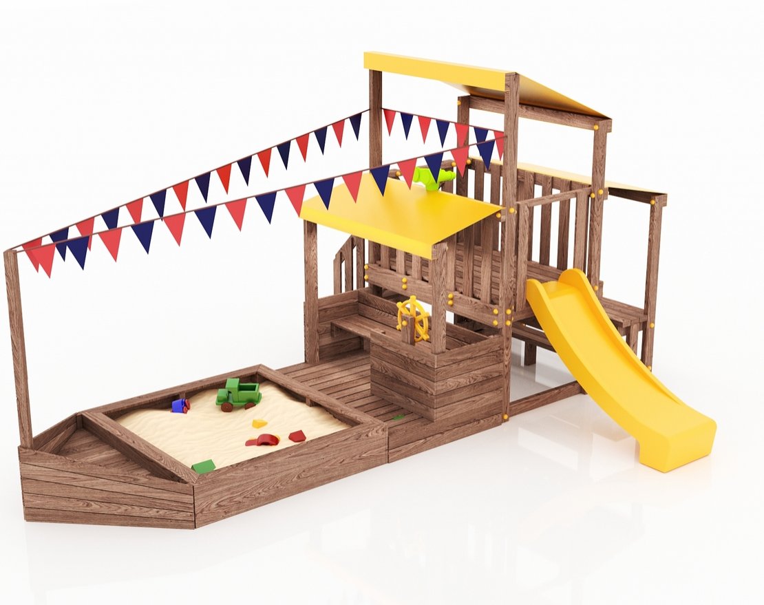 Детская песочница-кораблик, включающая в себя штурманскую рубку и капитанский мостик с горкой с высоты 900 мм с флажками.