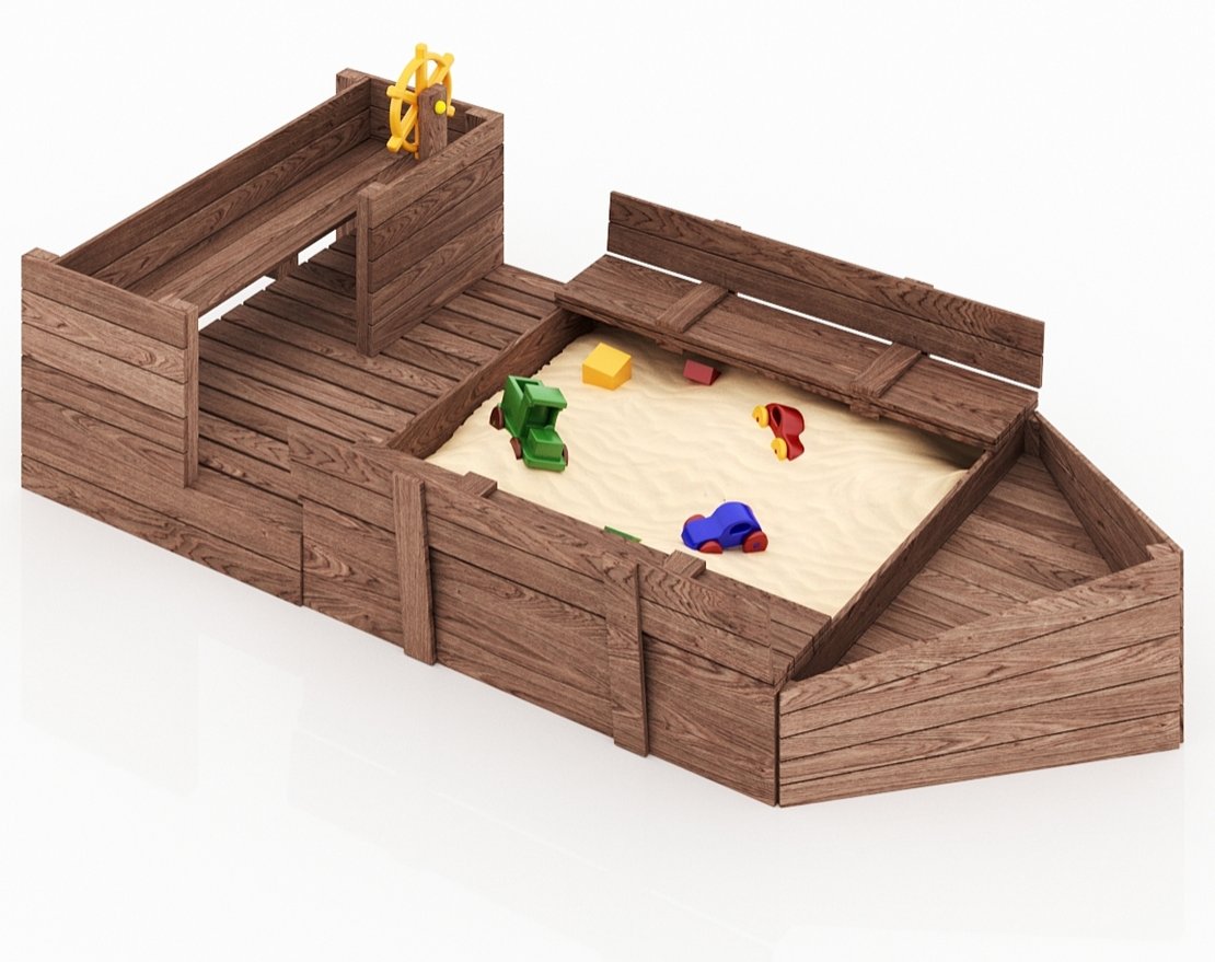 Детская песочница-кораблик и штурманская рубка со штурвалом.