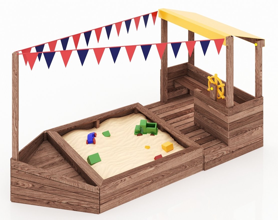 Детская песочница-кораблик и штурманская рубка со штурвалом с тентовой крышей.