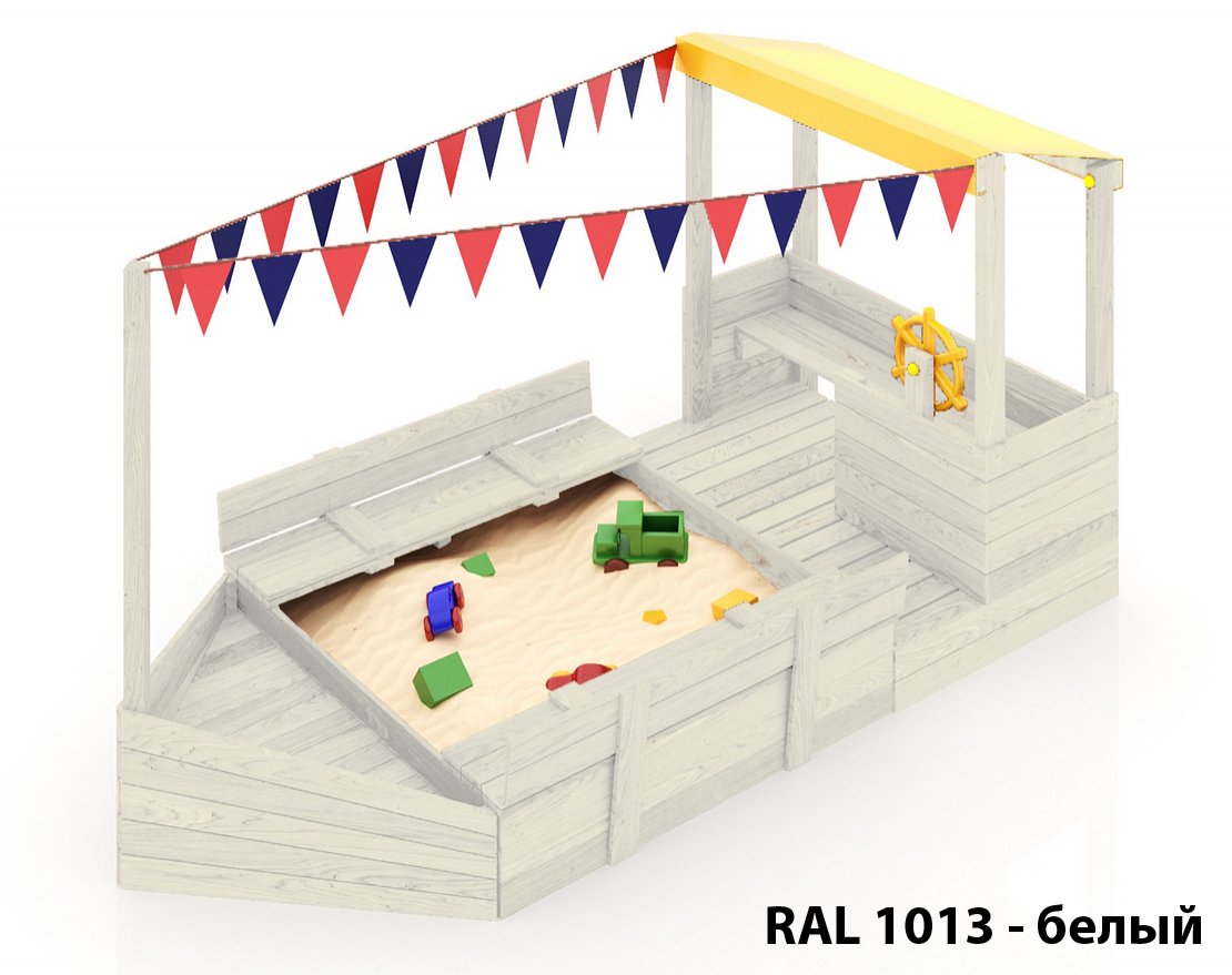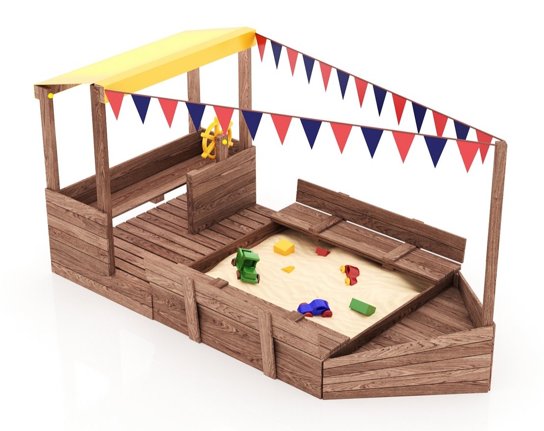 Детская песочница-кораблик и штурманская рубка со штурвалом.