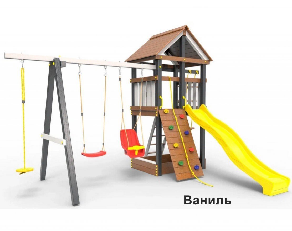 Площадка Сорбет Ваниль является одной из вариантов комплектации флагманской модели Ваниль и представляет собой двухуровневую конструкцию, на первом уровне которой расположена песочница, а второй этаж представляет собой игровое пространство под деревянной крышей. Конструкция оснащена качельной балкой, повышенной прочности, которая имеет 5 креплений для качелей или любого другого навесного оборудования, шторм-трапом ,горкой и скалодромом!