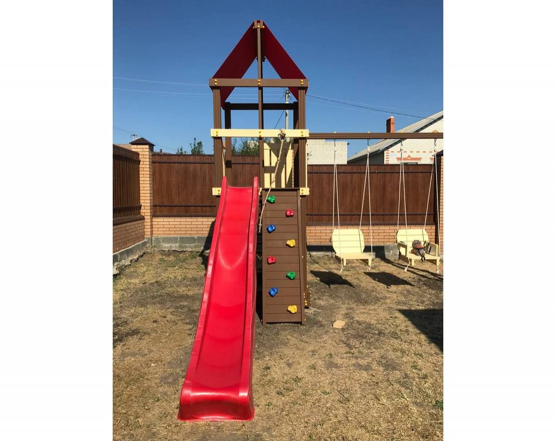 Изделие покрыто безопасной для детей высокоустойчивой краской на водной основе, которая надежно защищает древесину от воздействия окружающей среды. Перила, скалодром и лестница производятся по системе "шип паз".