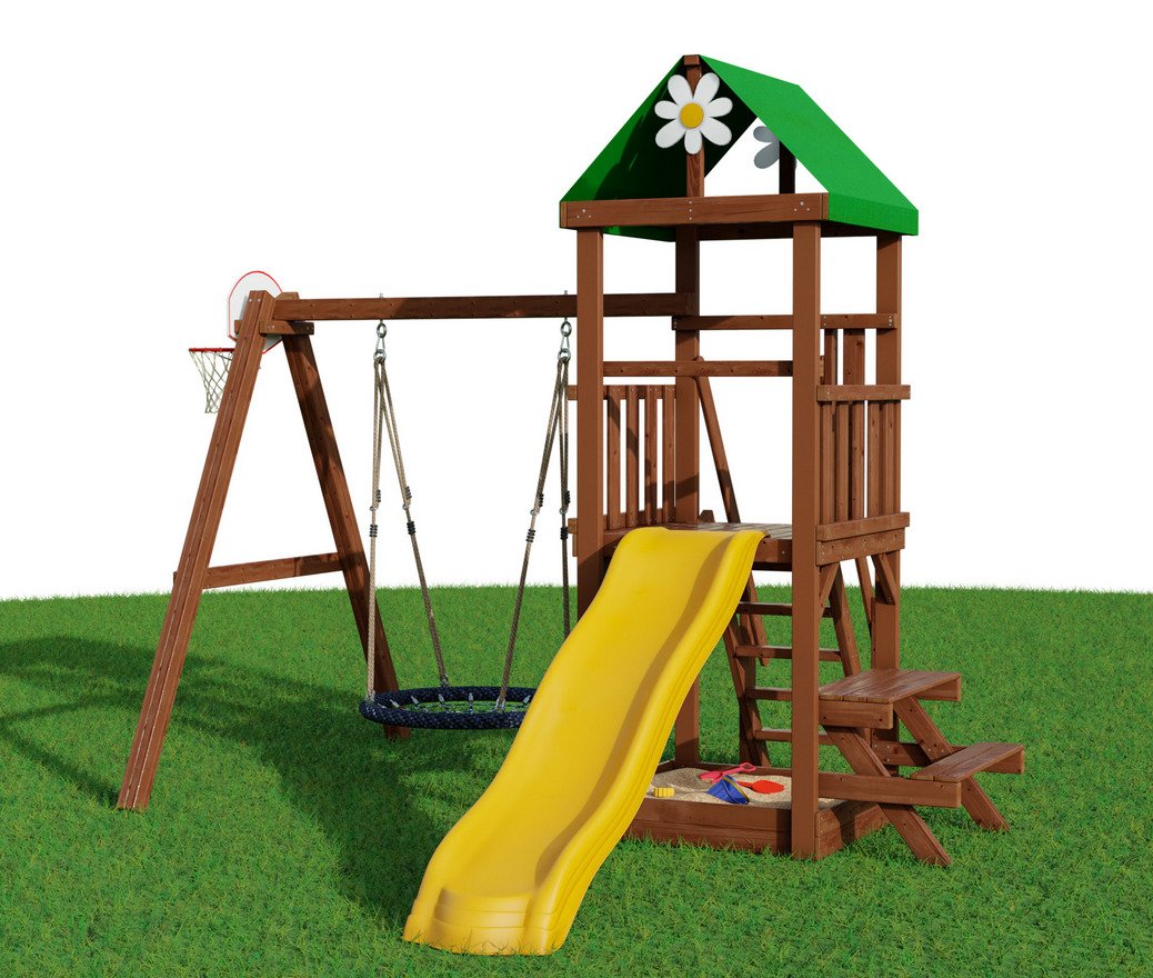 Удобная и компактная площадка подойдет для любого возраста. Малышей заинтересует горка и песочница, школьников – просторные качели «гнездо» диаметром 60 см, подростков – баскетбольное кольцо. Под яркой тентовой крышей можно переждать дождь.