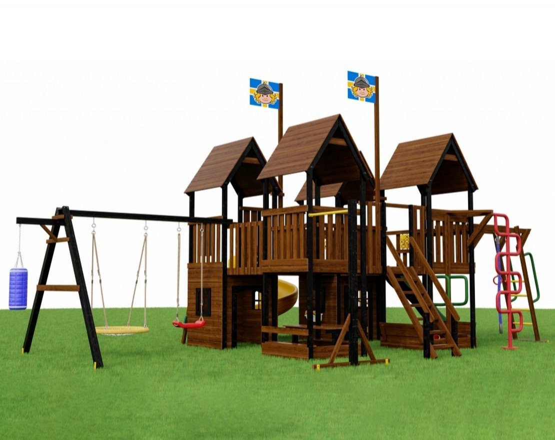 Яркие флажки задают сказочный настрой, а надёжная конструкция из тщательно обработанного дерева — спокойствие родителям. Детская площадка отлично подойдёт как для частного участка, так и для школы или детского центра — места хватит всем!