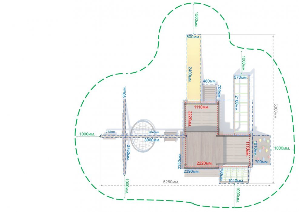 Площадь поверхности детской площадки = габариты конструкции по крайним точкам + 1000/1500мм. по периметру конструкции. Поверхность должна быть твердой, ровной, свободной от насаждений, горизонтальной без перепадов, допустимый уклон не более 20мм. на 10п.м.