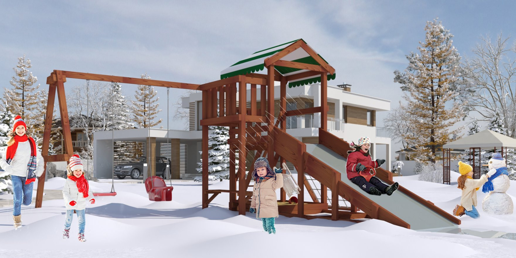 Сбоку к башне крепится качельная рама для двух элементов на выбор, например, качели «Лодочка» и «Люкс» со спинкой. Они очень нравятся как маленьким деткам, так и младшим школьникам.