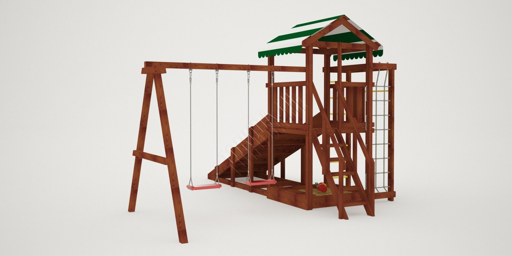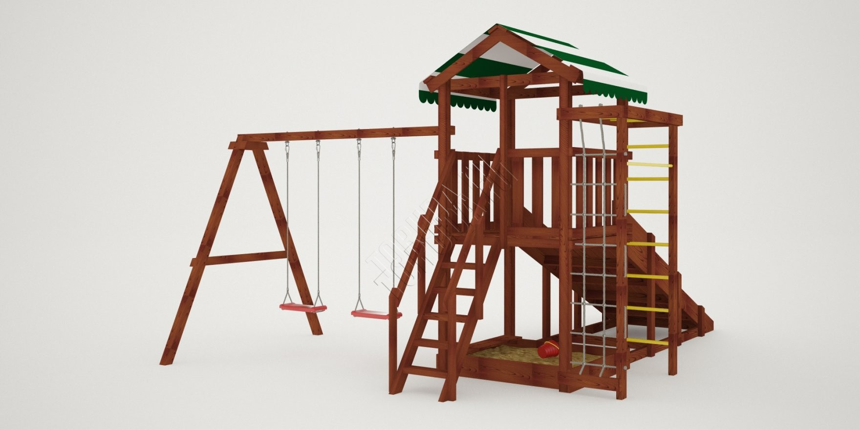Конструкция, качество дерева и качельные подвесы соответствуют ГОСТ. Основной материал натуральный – это экологичный клееный брус, он гладкий на ощупь, его углы скруглены во избежание получения ссадин. Площадка полностью безопасна: все крепежи и болты плотно закрыты заглушками, а спортивное оборудование используется от проверенного сертифицированного бельгийского производителя.