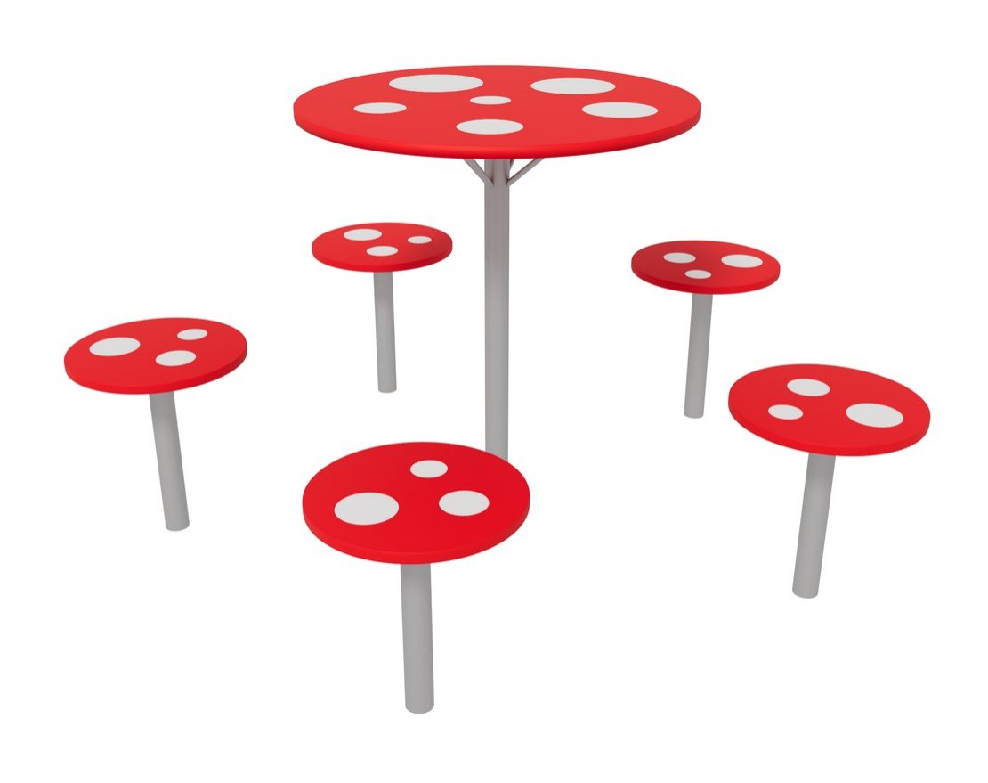 Столик с пятью стульями – это идеальное место для тихих детских игр. Здесь же ребята могут кушать и отдыхать после активных развлечений. Для большей безопасности рекомендовано бетонировать основание дачного «аксессуара», чтобы даже самые шустрые ребята случайно не уронили его.